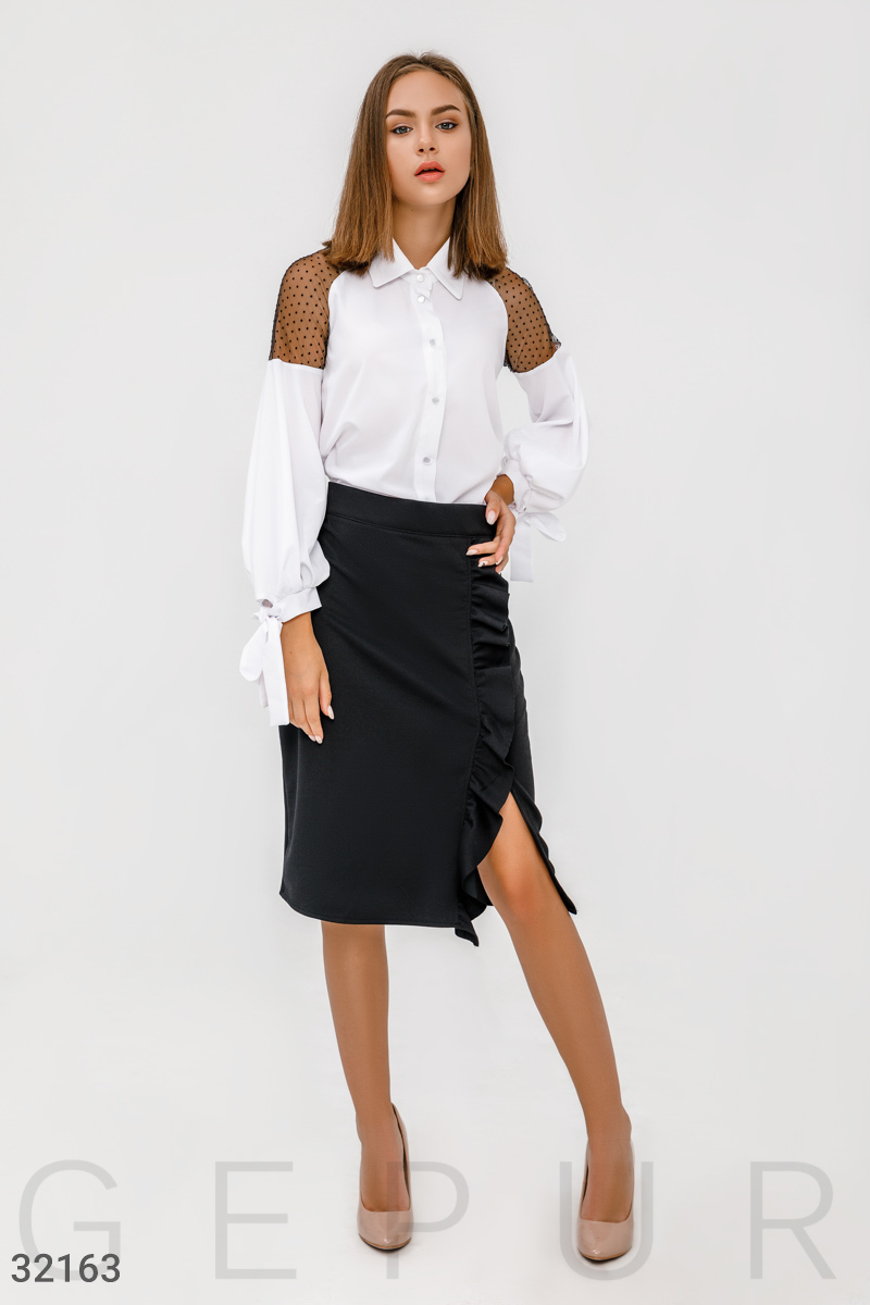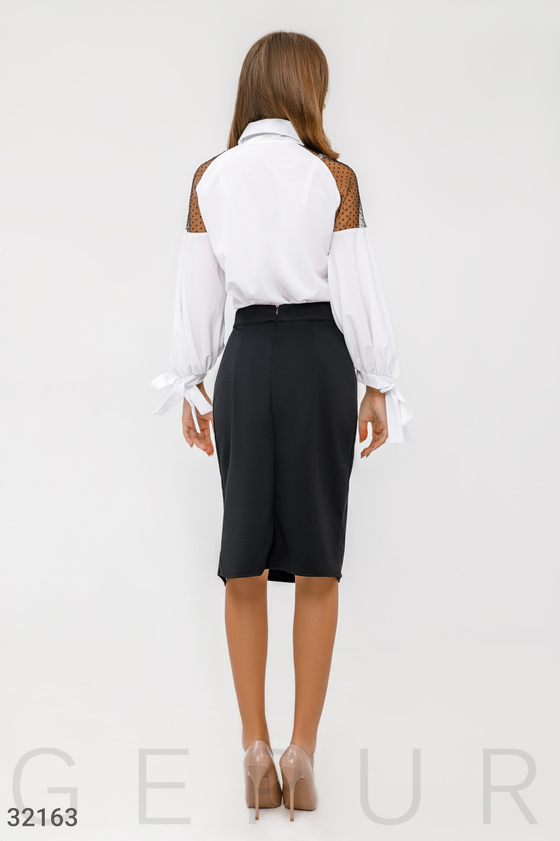 Утонченная рубашка черного цвета с отложным воротником, длинным объемным рукавом с прозрачными вставками на плечах и манжетой с завязками.
