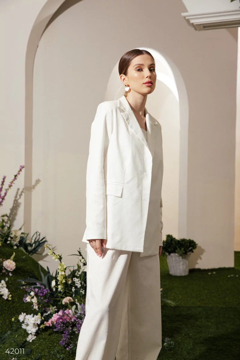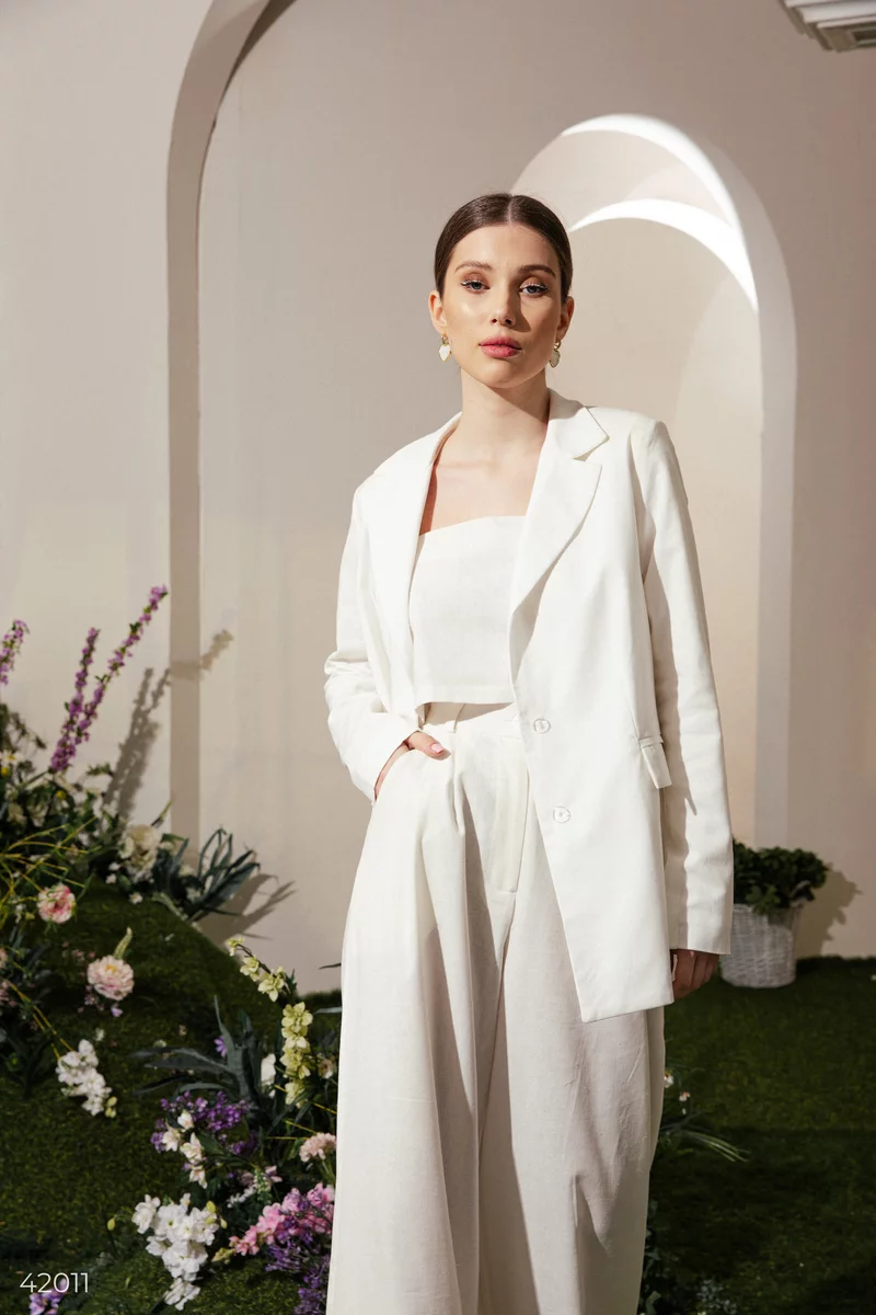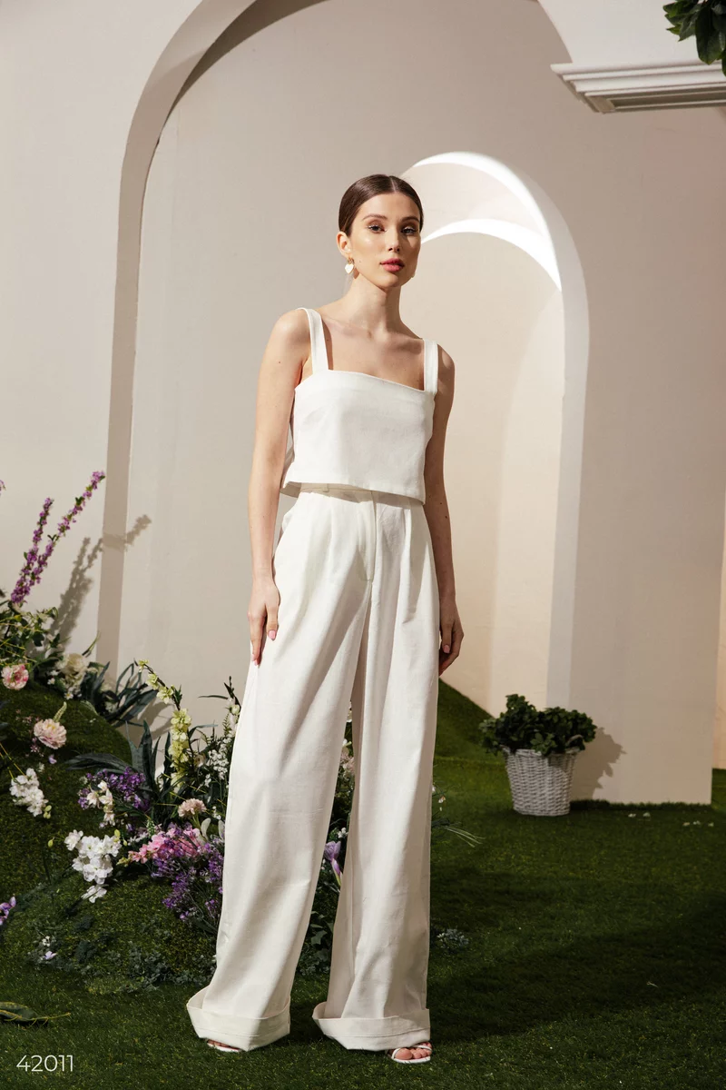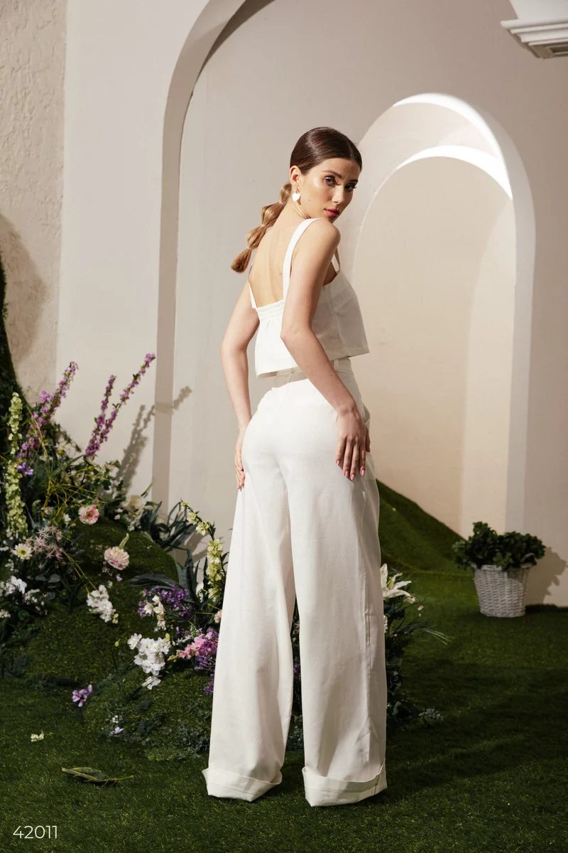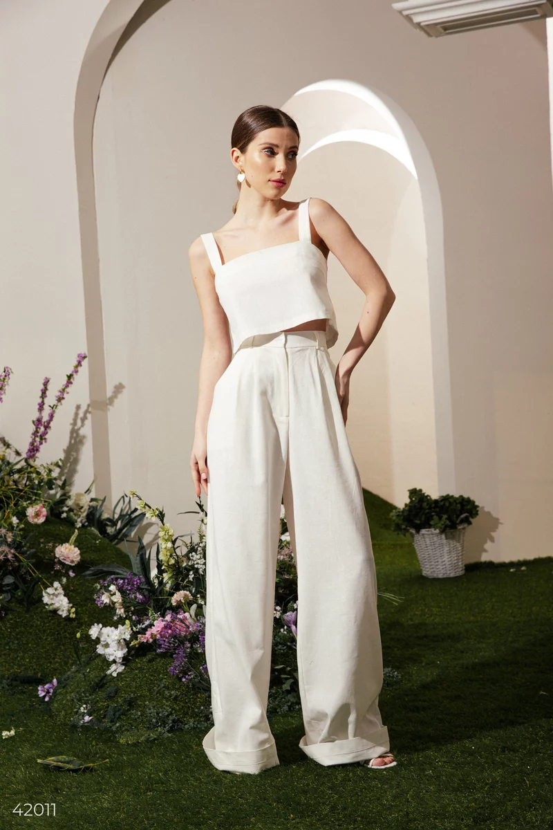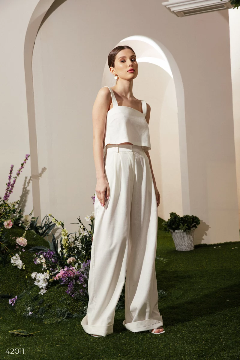 Loose fit summer trousers made of linen fabric in basic white color. Comfortable mid-rise and elastic waistband. The model is ideal for a relaxed summer look.