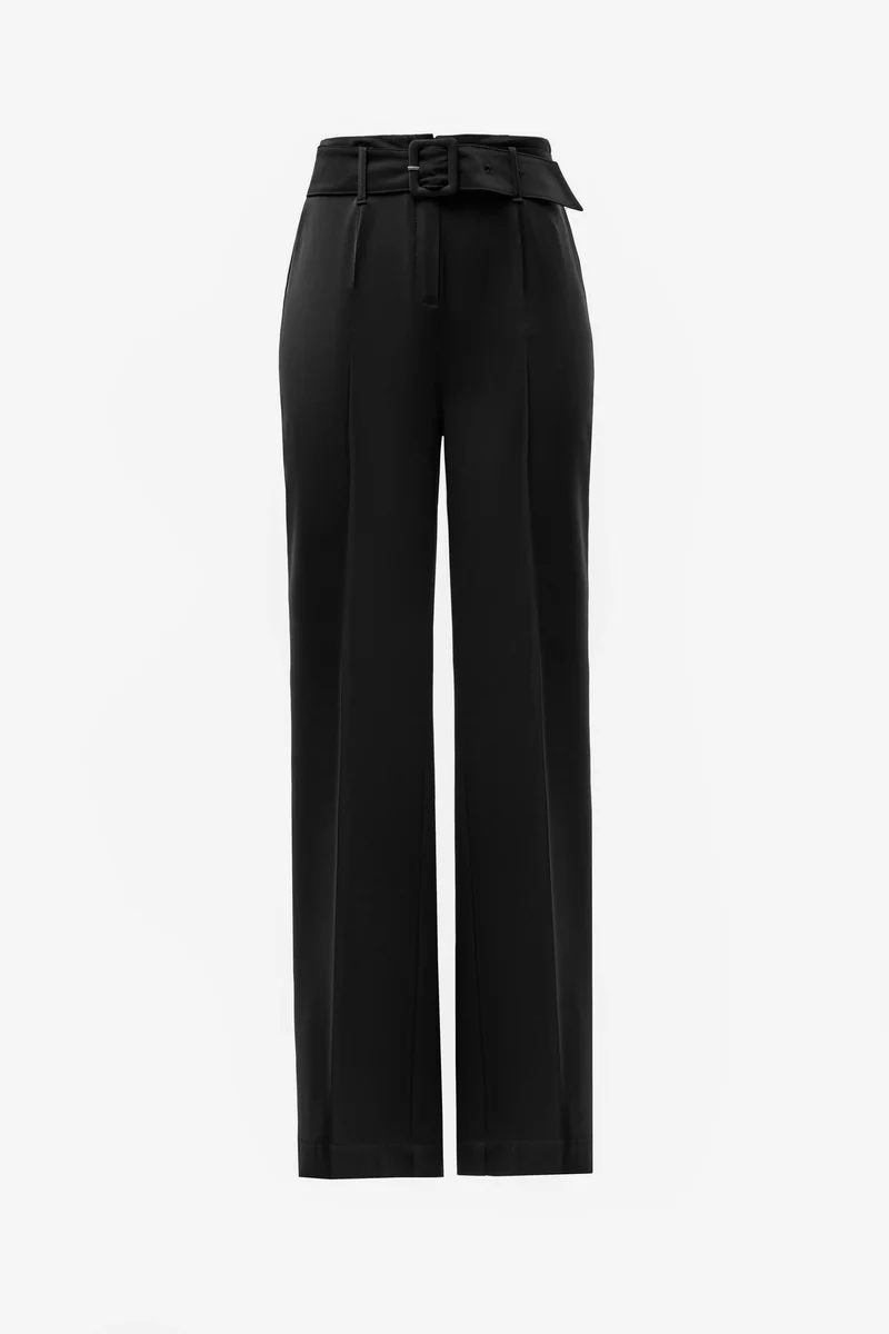 Straight-cut trousers made of satin with a smooth texture that feels comfortable on the body. The high waist visually lengthens the legs. Fastens with a hidden zipper in the front. Removable belt with buckle included