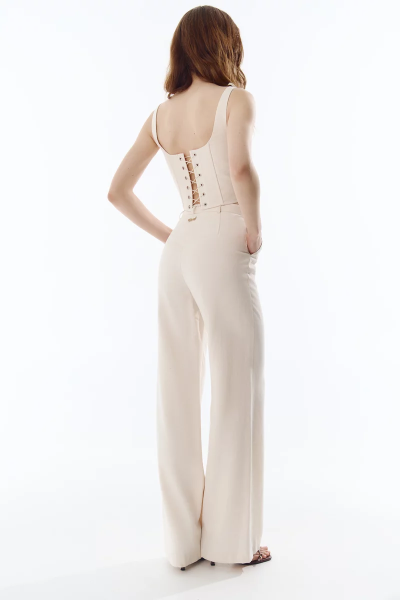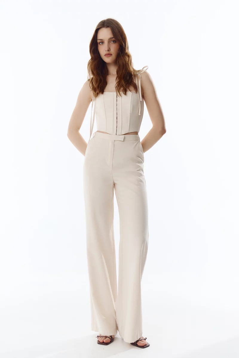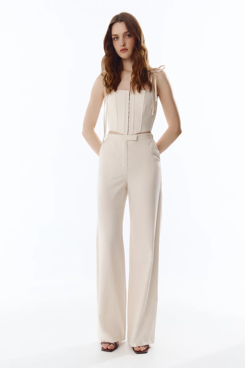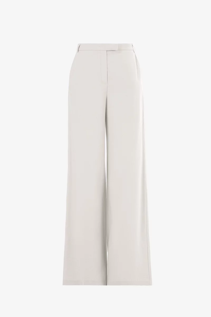 Palazzo pants with a loose, straight cut made of soft, body-friendly suiting fabric. High-rise model, side pockets. The pants fasten with a hidden zipper at the front