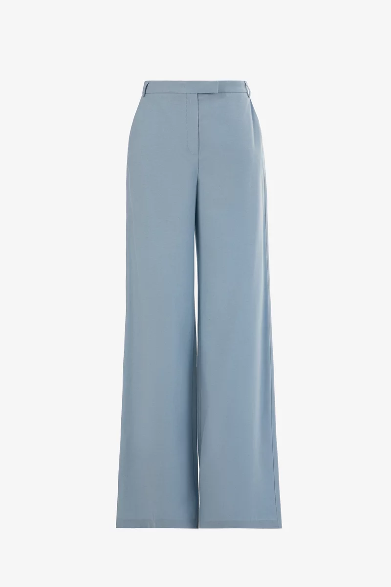Palazzo pants with a loose, straight cut made of soft, body-friendly suiting fabric. High-rise model, side pockets. The pants fasten with a hidden zipper at the front