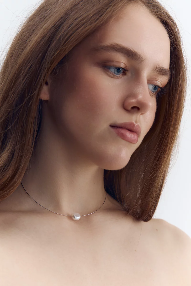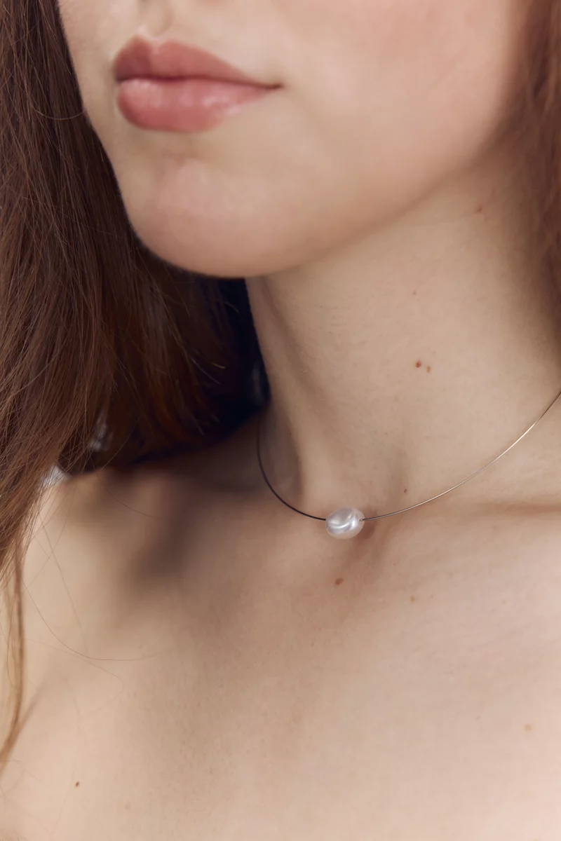 Choker with pearl, silver hardware. One universal size (adjustable) - minimum diameter 11.5 cm. Made of high-quality jewelry alloy, which, with proper care, does not darken and lasts a long time. The coating does not wear off, does not oxidize and does not leave marks on the skin