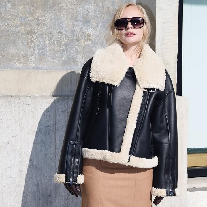 Trendy aviator jacket with a short cut. Wide turn-down collar with fur trim and strap closure. Long wide sleeves with dropped shoulders and two small pockets on the sides. The jacket is made of textured premium eco-leather.