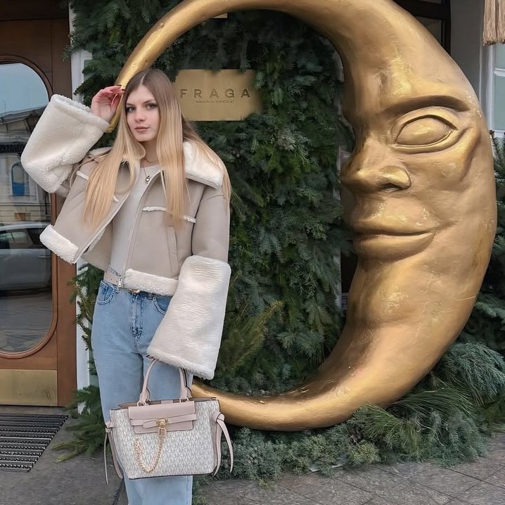 Trendy aviator jacket with a short cut. The voluminous turn-down collar is fastened at the neck with straps. Long wide sleeves with fur trim and two small pockets on the sides. The jacket is made of textured premium eco-leather.