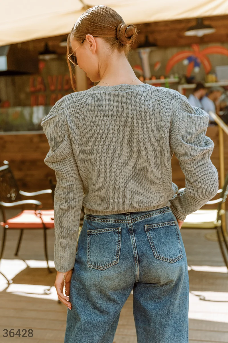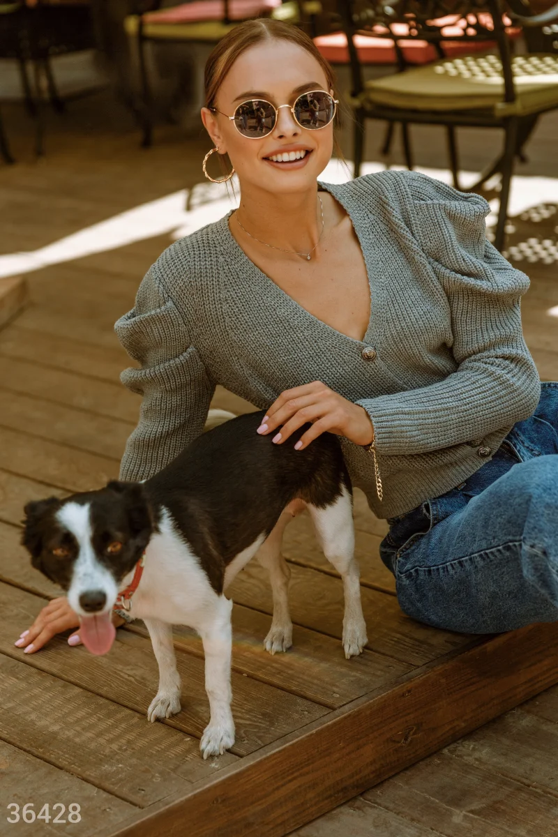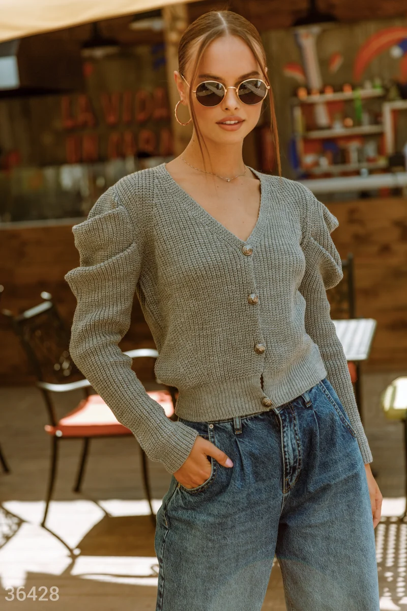 The cropped model is complemented by one of the main trends of 2020 - pintucks on the shoulders. This style adds volume and shifts the focus to the top of the product. The cardigan is made of knitted jersey, which provides a feeling of warmth and comfort in cold weather.