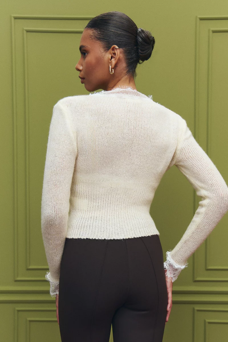 Cardigan in a soft, blended knit. Bodice and cuffs with accent lace inserts. Button fastening. Store folded to prevent stretching