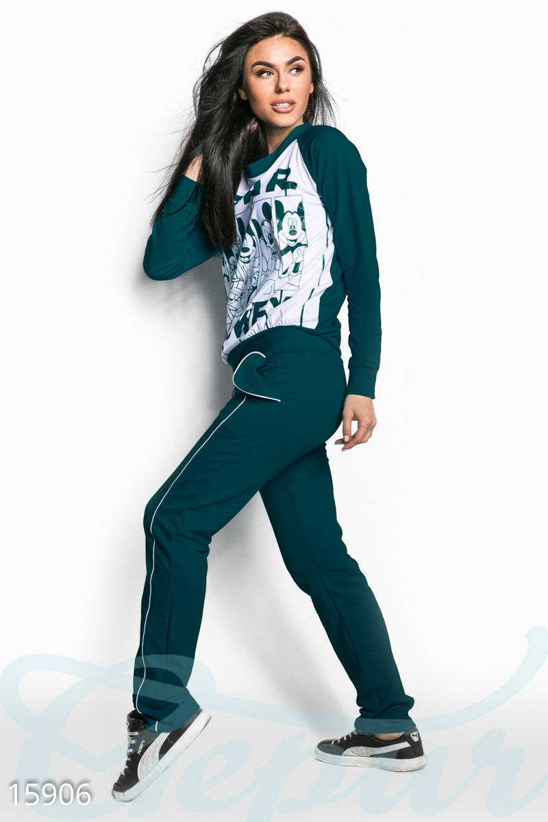 Спортивный костюм с веселым накатом "Микки Маус". На кофте рукава с манжетами. Штаны с поясом на резинке, по бокам есть два кармана с клапанами. Это отличный вариант для спортивной тренировки, отдыха дома или на природе. Материал: двунить, вставки стеганый трикотаж Застежка: отсутствует Длина: кофта - 63 см, длина рукава по внутреннему шву - 54 см, штаны - 97 Цвет: темно-зеленый