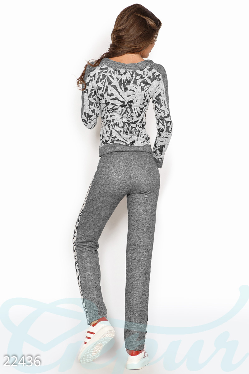 Женский костюм-двойка из комбинированной ткани: куртка классического кроя с застежкой на молнию, брюки прямого кроя с двумя карманами и контрастными вставками-лампасами.