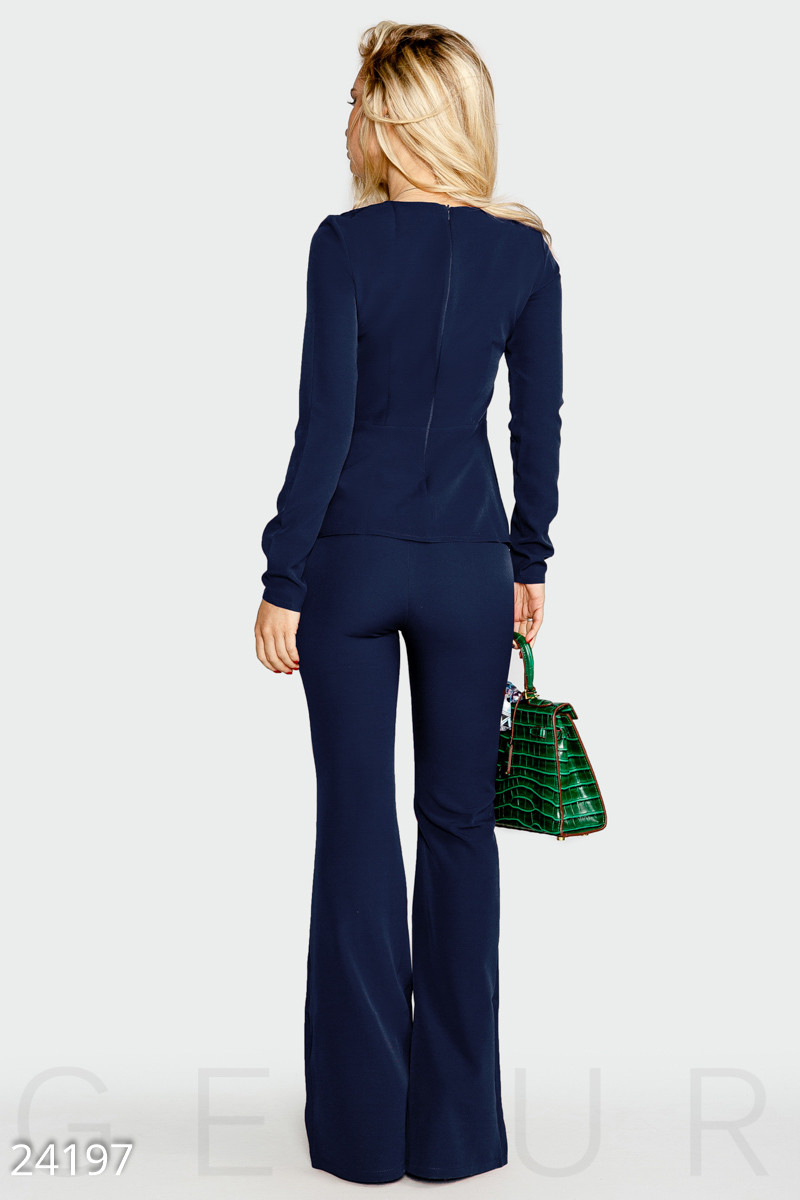 Эффектный брючный костюм, выполненный в деловом стиле: топ с небольшой баской и вытачками на груди, брюки-клеш средней посадки с широким втачным поясом.