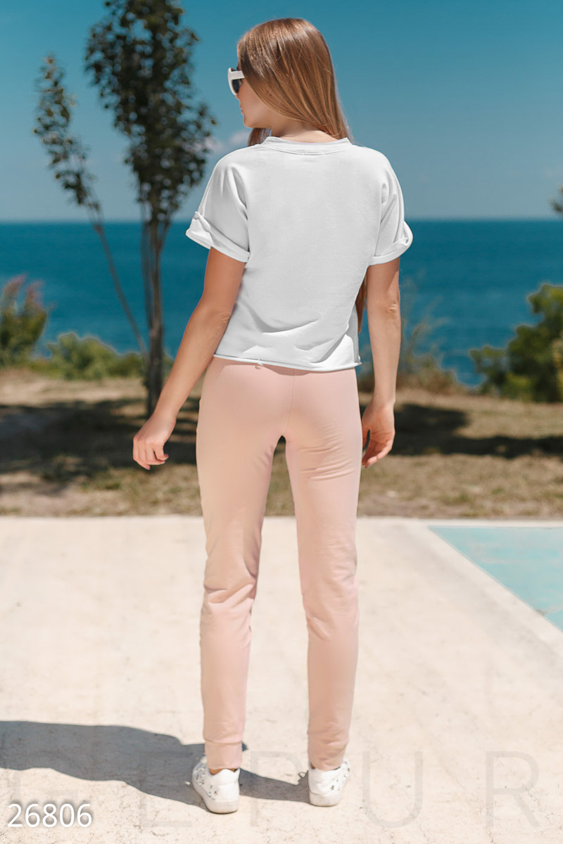 Летний костюм из трикотажной ткани: укороченная футболка с необработанными краями, рукавом-реглан и нашивкой с пайетками на груди, брюки средней посадки с манжетами и двумя карманами по бокам. .