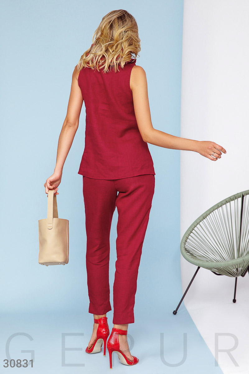 Легкий костюм, выполненный из дышащей ткани: блуза без рукавов с глубоким v-образным вырезом, дополненным рюшами, зауженные брюки средней посадки на эластичном поясе, двумя прорезными карманами по бокам и небольшими разрезами внизу.