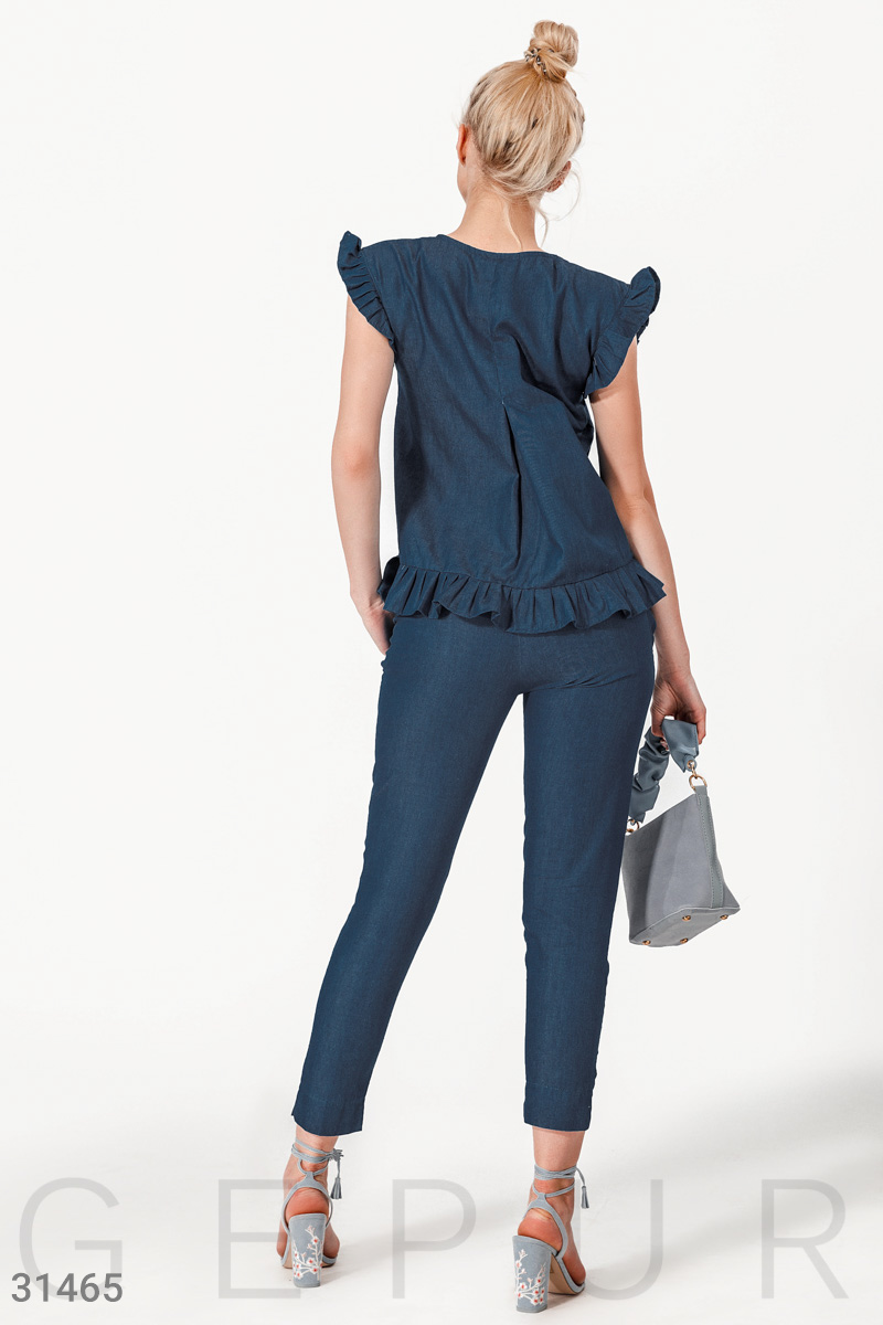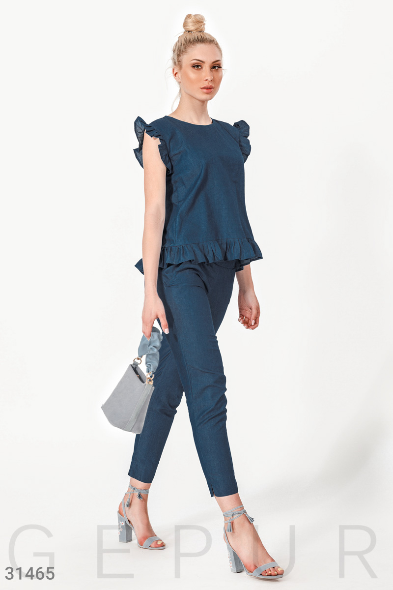 Повседневный денимовый комплект: блуза свободного кроя с классическим круглым вырезом, рукава-крылышки и подол декорированы рюшем, зауженные брюки с высокой посадкой на эластичном поясе и двумя прорезными карманами.