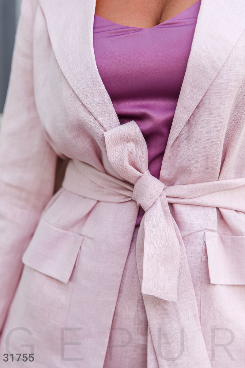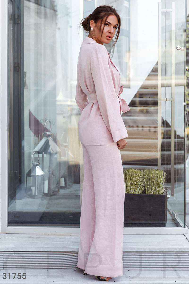 Трендовый брючный костюм от дизайнеров Gepur, пошитый из ткани premium-класса: жакет в стиле oversize, с однотонным поясом, прорезными карманами с клапаном, классическим отложным воротником и лацканами, брюки свободного кроя с высокой посадкой.