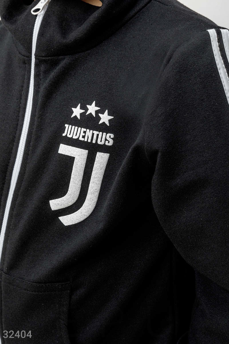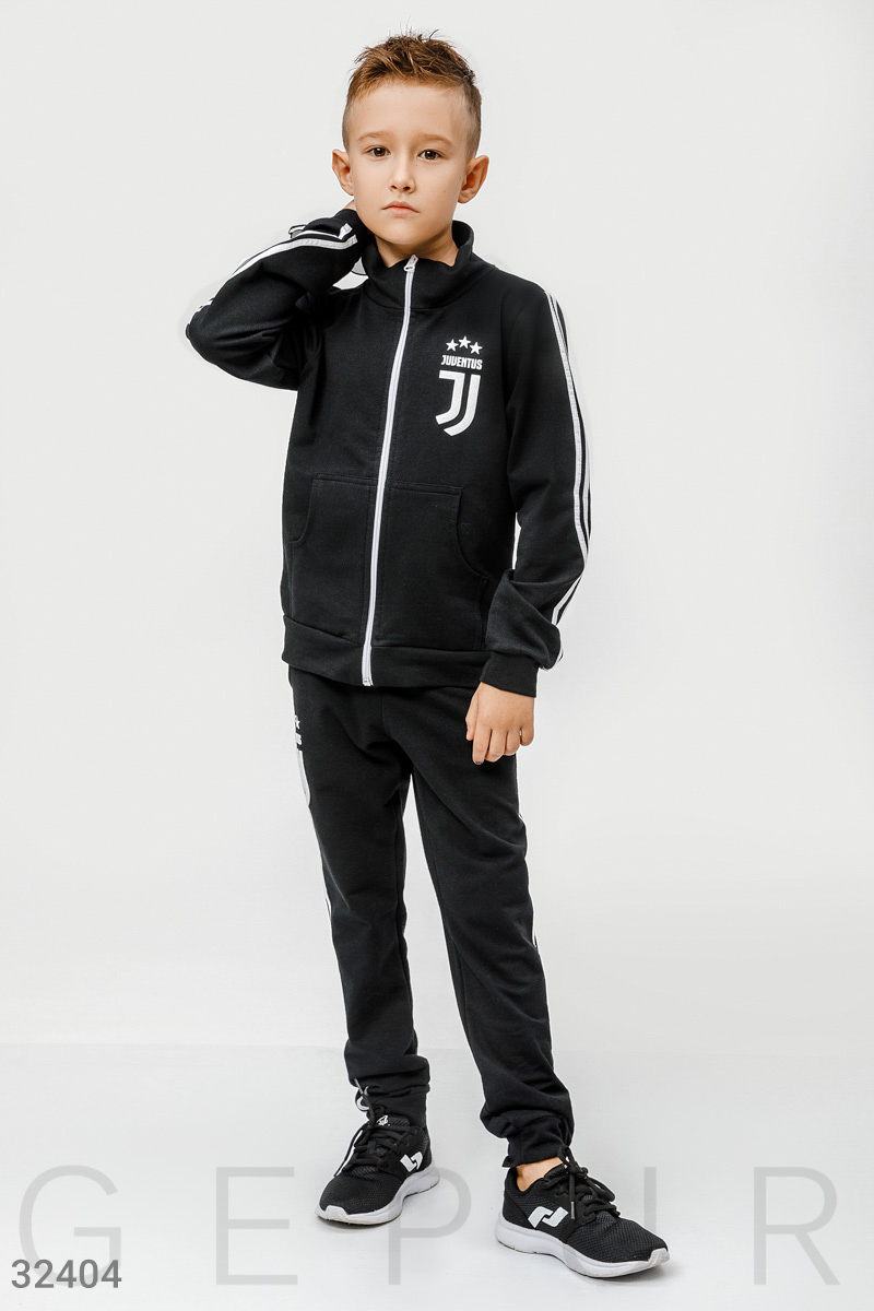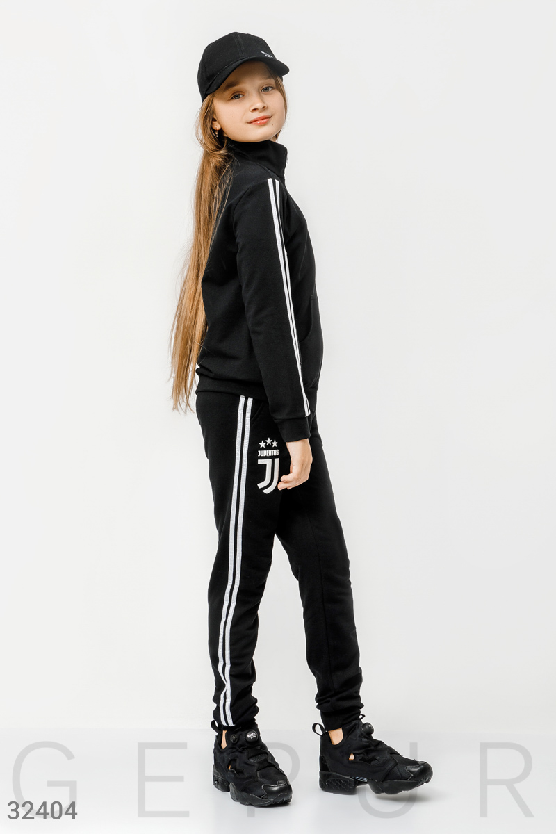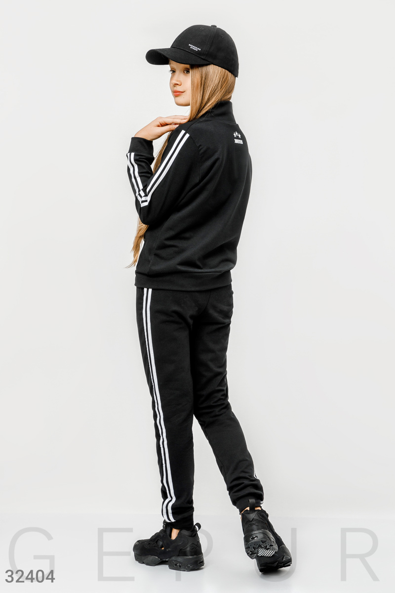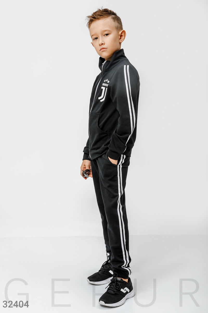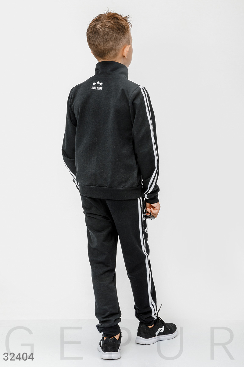 Детский трикотажный костюм черного цвета: куртка с воротником-стойкой, на молнии, длинным рукавом с контрастными вставками на плечах, прорезными карманами, брюки средней посадки с эластичной вставкой на талии и завязками, двумя прорезными карманами и лампасами.