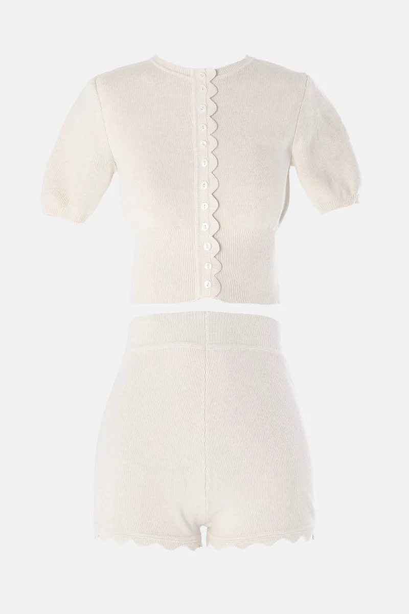 Crop top and ultra-short shorts set in a body-hugging jersey. Short-sleeved top with buttons at the front. Shorts are styled with an asymmetrical hem and high elastic waist. Top and shorts can be worn together or separately, combined with other clothing items and accessories