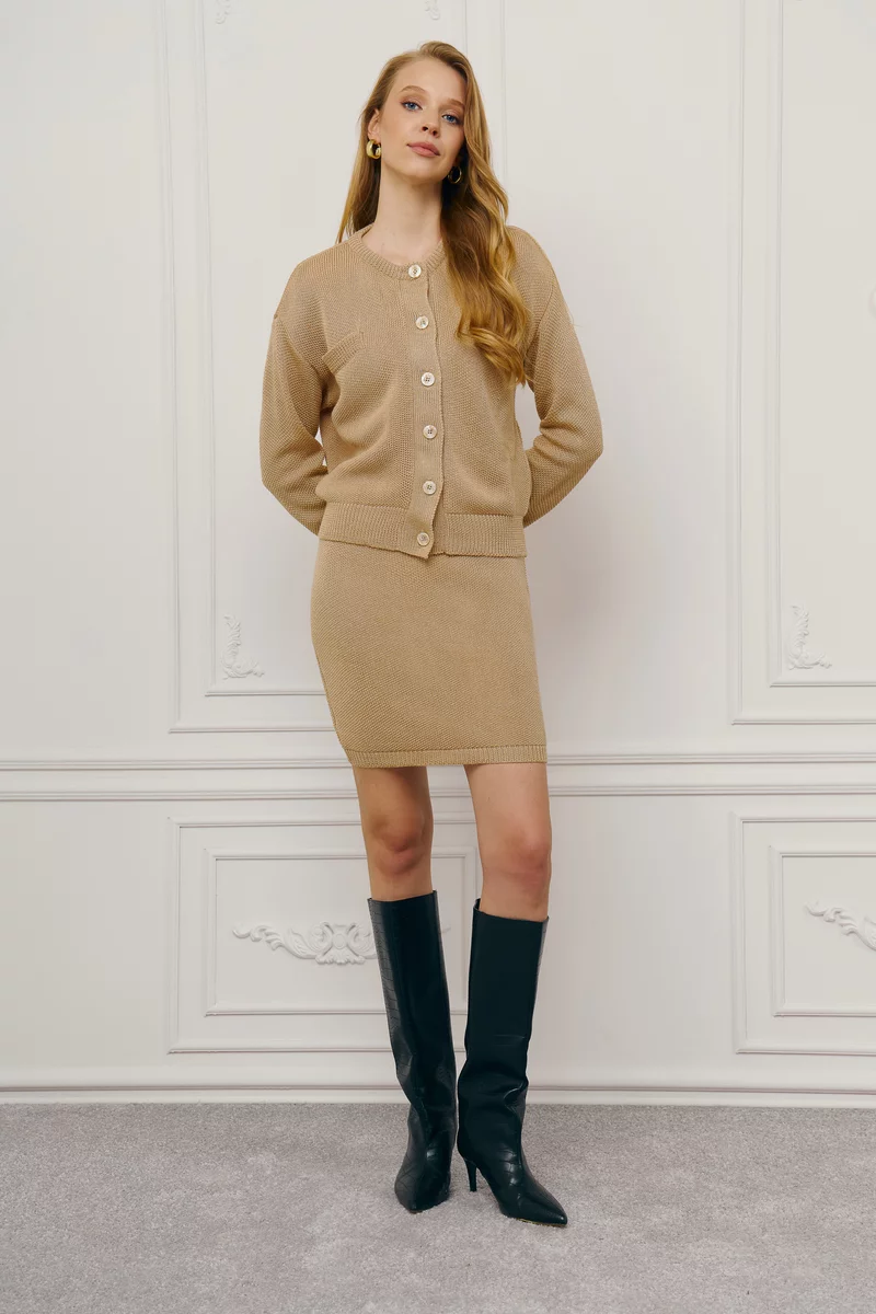 The set in a body-friendly knit includes a button-up cardigan and a mini skirt. The skirt has a high waist and an elastic waistband. Due to their versatility, the cardigan and skirt can be worn together or separately