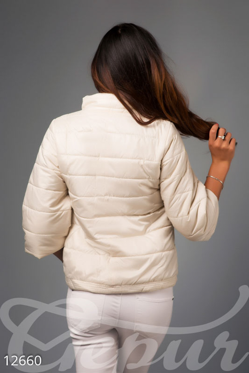 Bright quilted jacket with pockets on the sides zipper. Three quarter sleeve. In cold weather, a jacket is better to wear a sweater or a long sleeve or gloves to the elbow. Will look great with jeans or track pants. Material: plaschevka on internetlink: 60 mcvet: cream