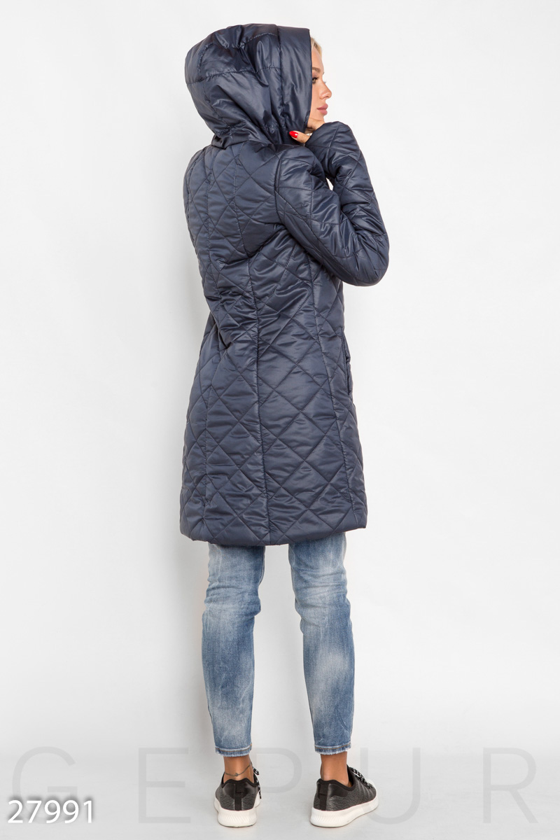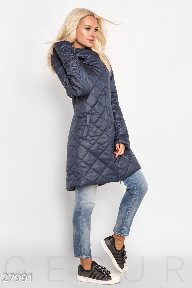 Утепленное стеганое женское пальто с пришивным капюшоном, асимметричной застежкой и двумя карманами по бокам.