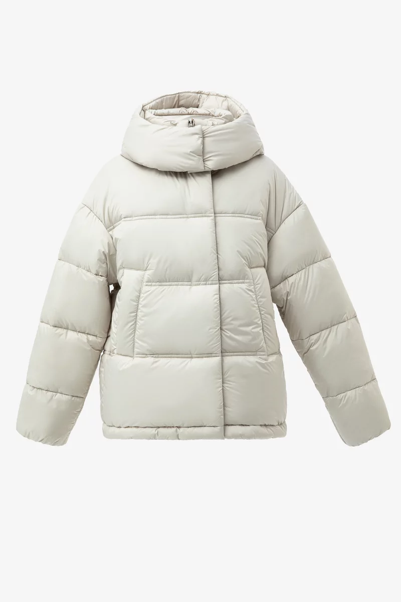Oversized straight-cut down jacket - a basic model for every day. Removable hood with a wide stand-up collar with buttons. Zipper and buttons on the front. Side slit pockets additionally fastened with buttons. Cuffs with internal elastic, which allows you to retain heat well. Filler - synthetic winterizer