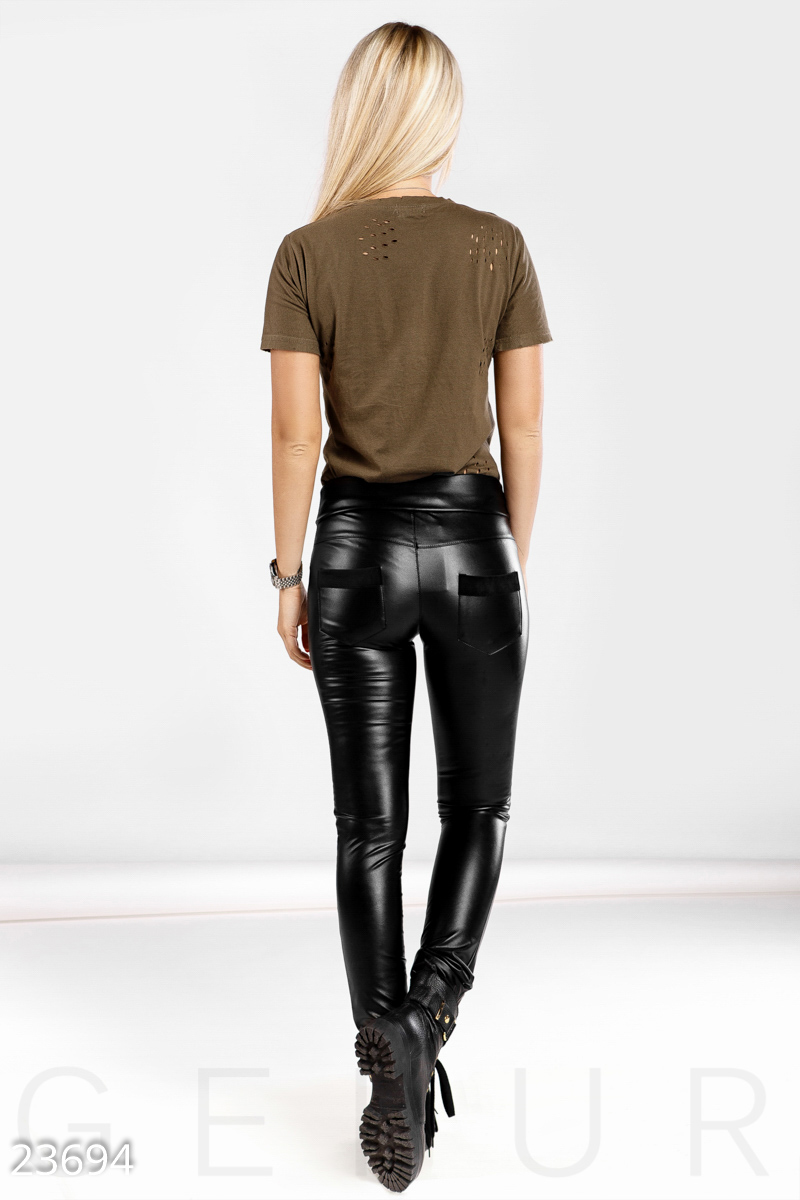 Женские леггинсы из эко-кожи с флисовым внутренним слоем в классическом исполнении: широкий втачной пояс с резинкой и два накладных кармана сзади, дополненные вставкой из эко-замши.