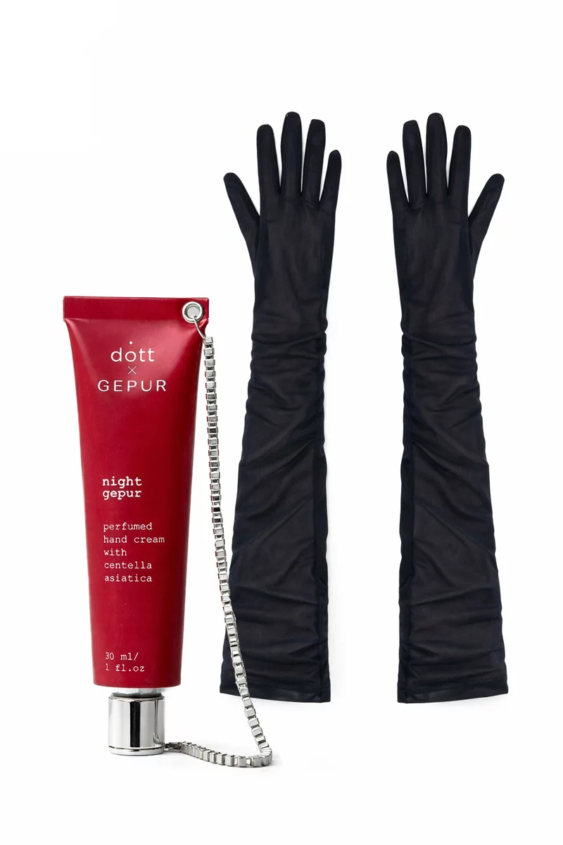 Set of long stretch mesh gloves and NIGHT GEPUR perfumed hand cream. Apply the cream, then put on the gloves - this set will become your little ritual of beauty and care