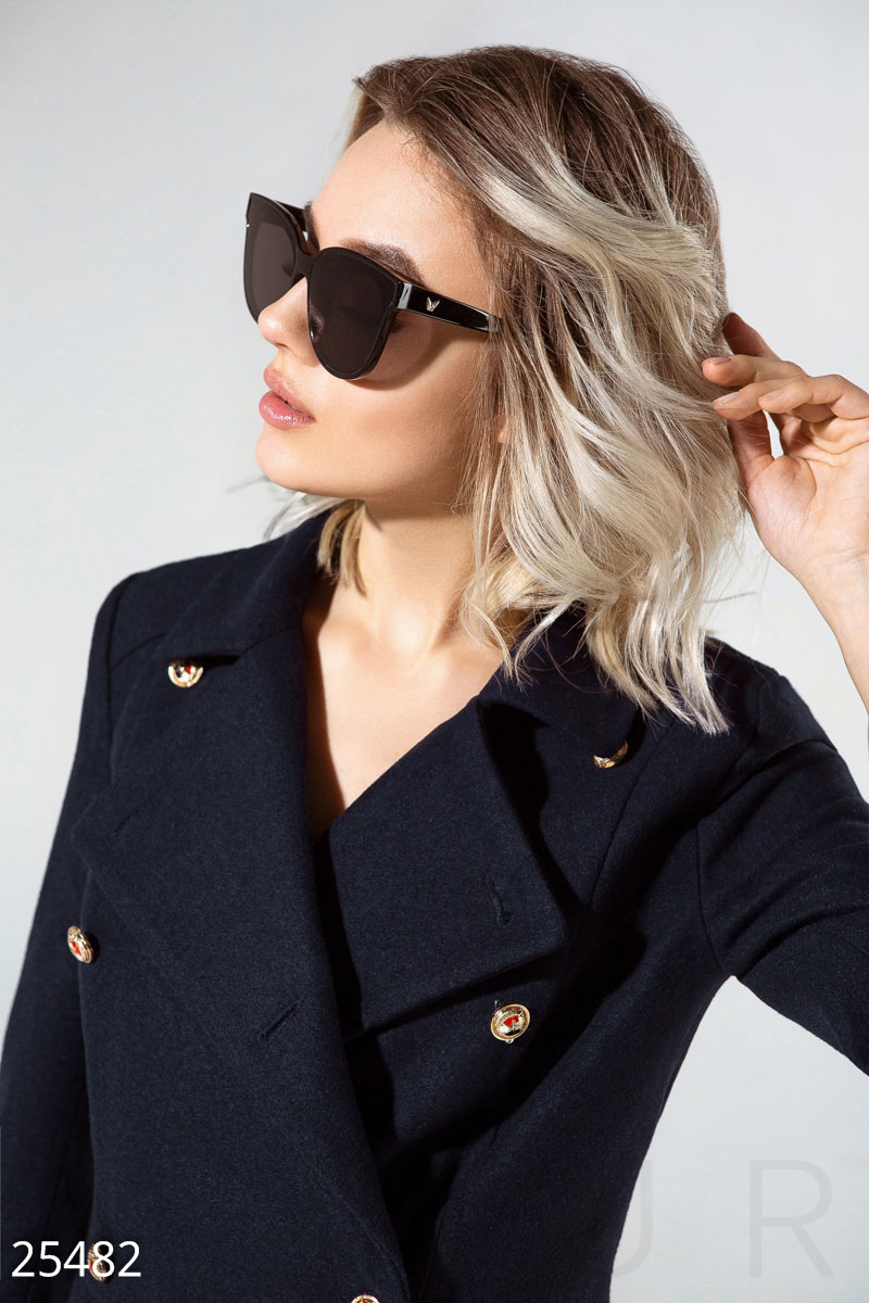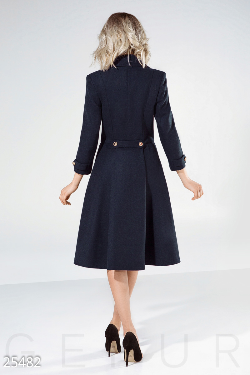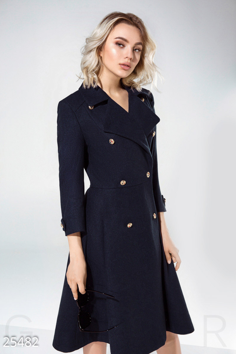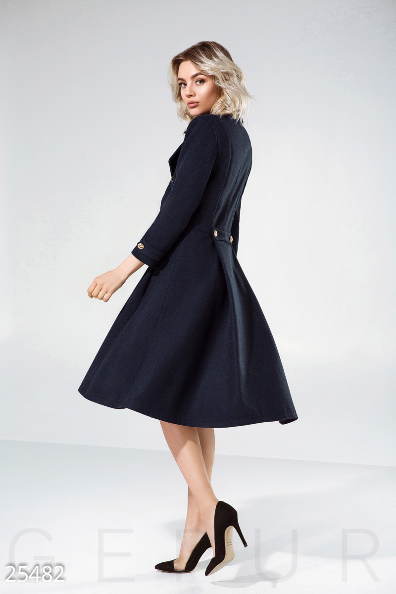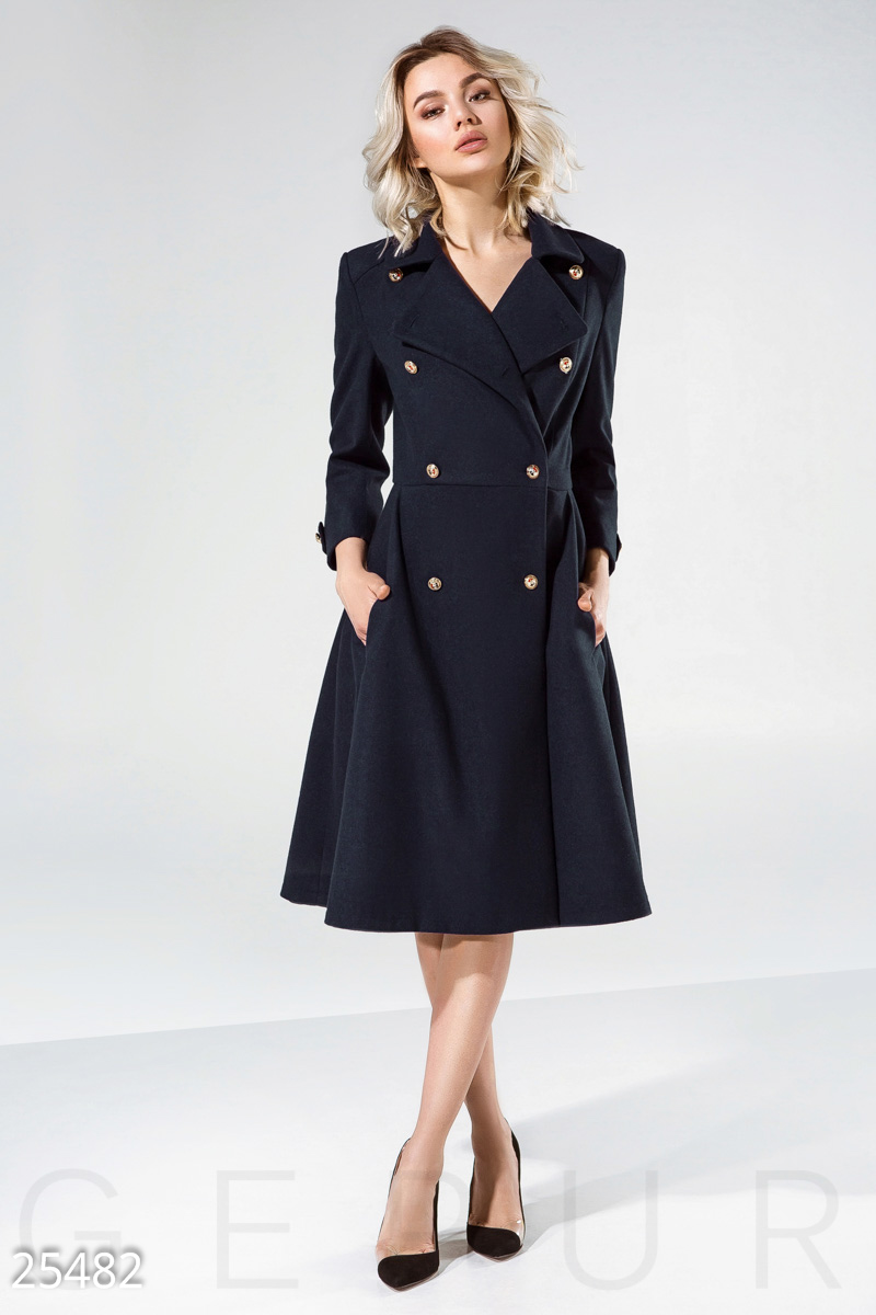 Расклешенное двубортное пальто от дизайнеров Gepur, выполненное из пальтовой ткани premium класса: отложной воротник с аккуратными лацканами, рукав 3/4, два кармана в швах и хлястики с пуговицами.