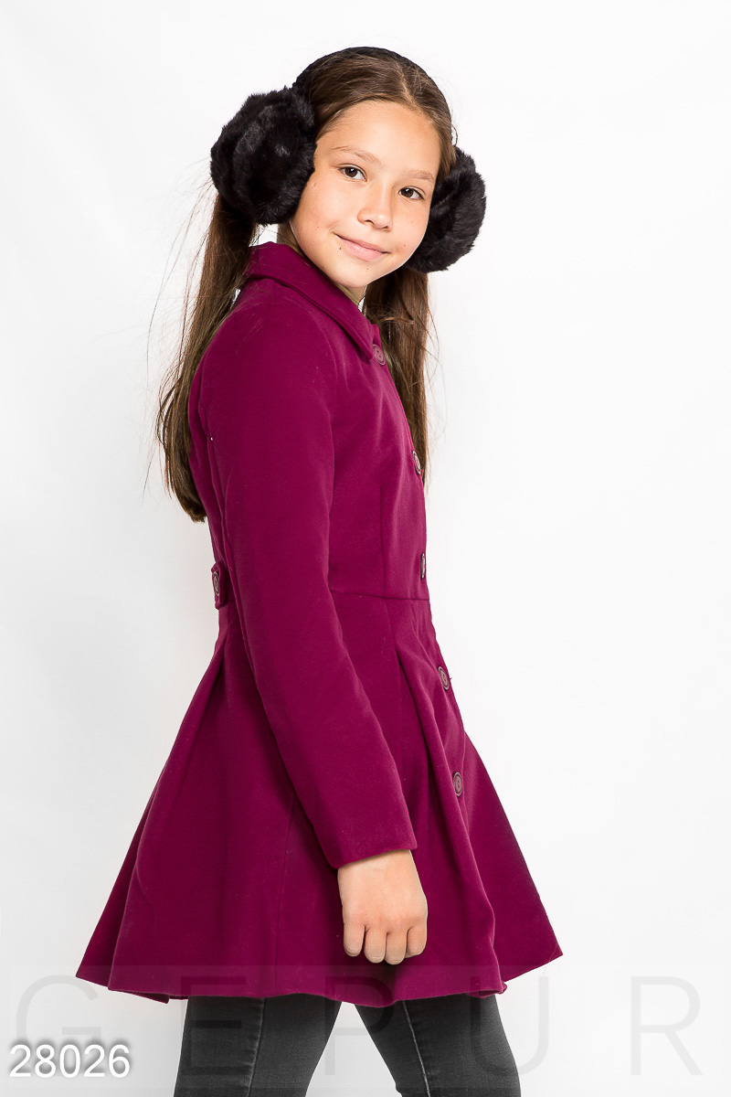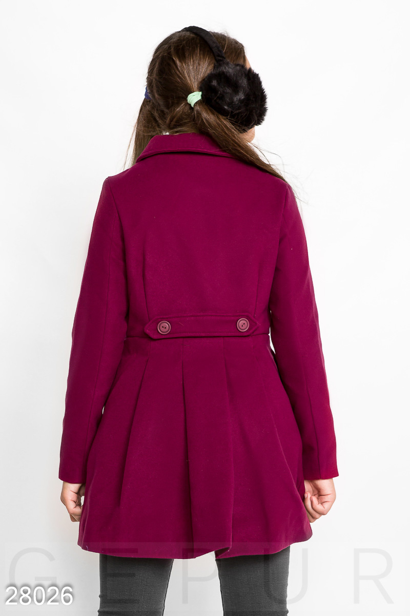Приталенное детское пальто из эко-кашемира: классический отложной воротник, два кармана в швах и хлястик на поясе.