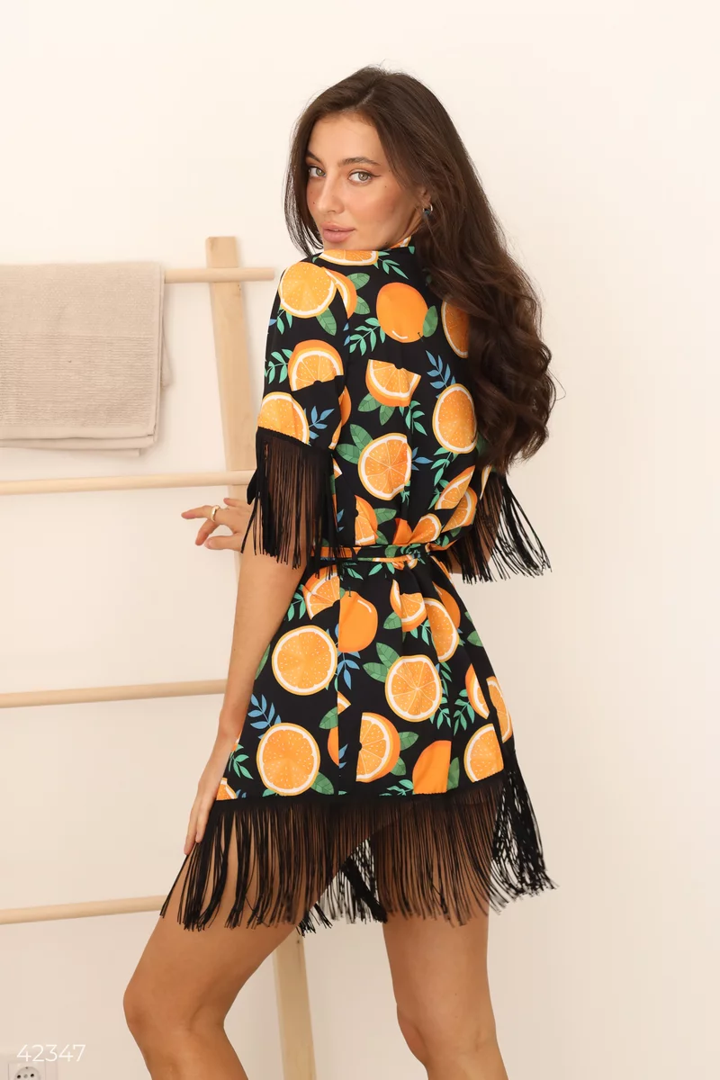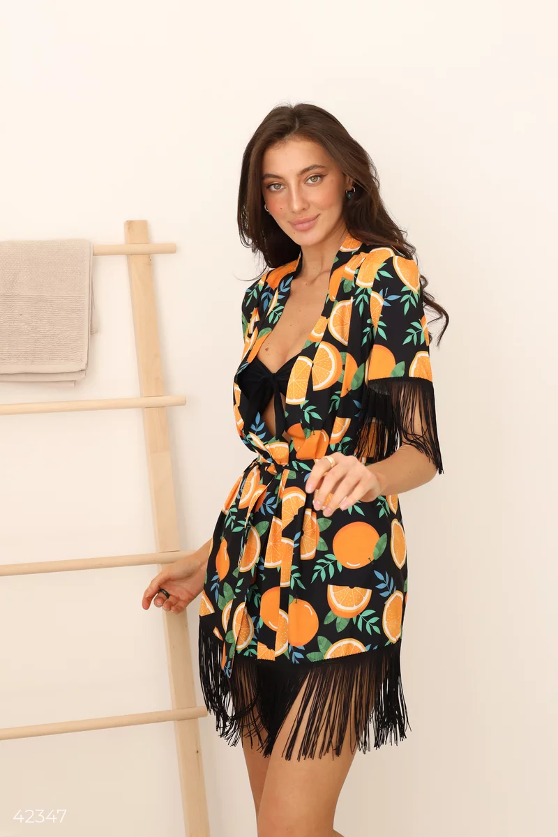 Beach cape in a bright fruity print. It is fixed on the smell with the help of a belt. The hem of the cape and sleeves are decorated with fringe.