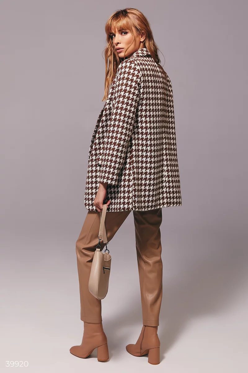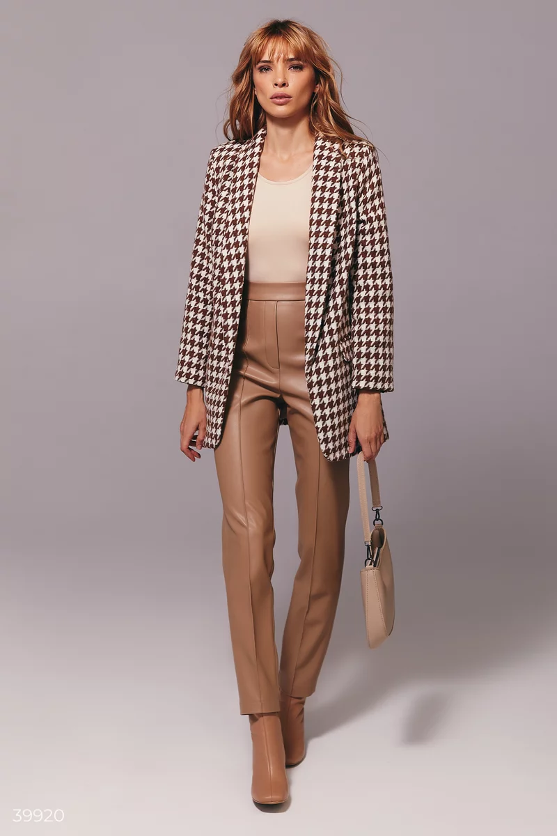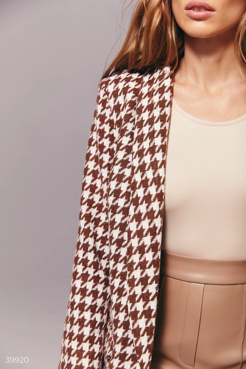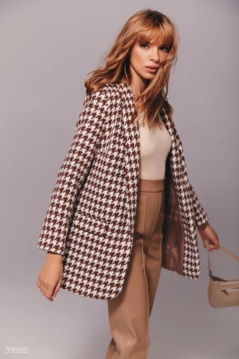 A versatile beige houndstooth blazer can complement a variety of looks and become an indispensable part of your wardrobe. The classic model is reminiscent of the Chanel style, which adds elegance to this piece.