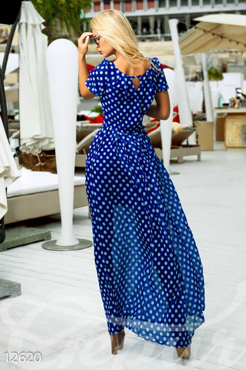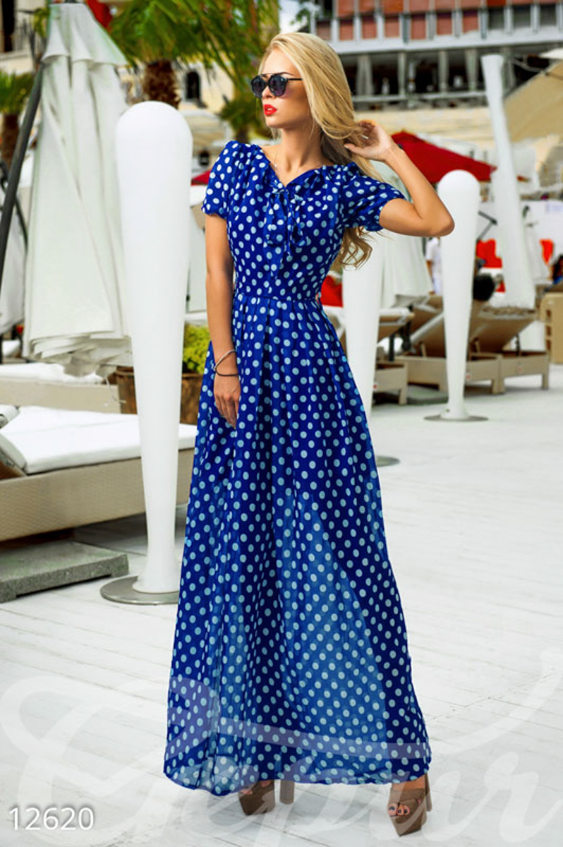 Актуальное в этом сезоне длинное платье в горошек отлично подойдет для прогулки летними вечерами. Выполнено из легкого летящего шифона. На воротнике можно завязать бант из поворозочек. Изюминка изделия - модные рукава-фонарики. Платье с завышенной талией сбоку застегивается на молнию-невидимку. Юбка свободного кроя из полупрозрачного шифона на короткой синей подкладке. Материал: шифон Длина: 141 см Цвет: синий в белый горошек