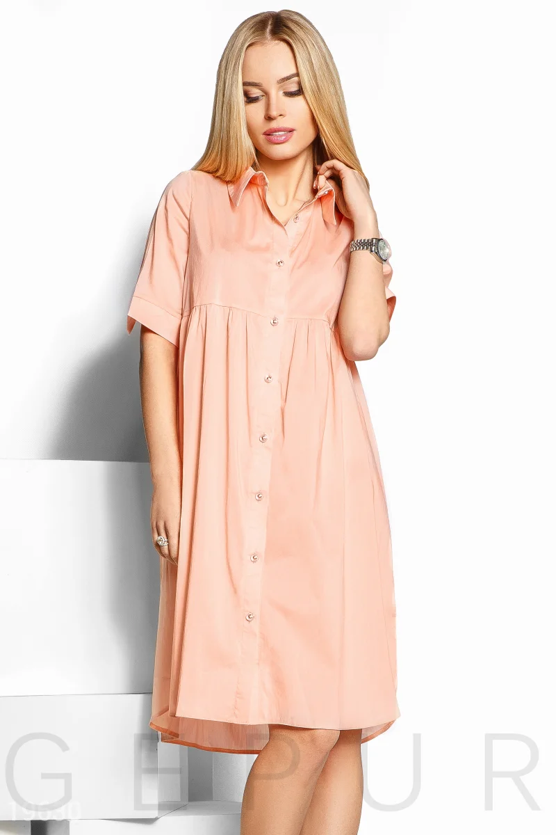 Летнее платье-рубашка из легкой хлопковой ткани: строгий отложной воротник, короткий рукав с застежкой на пуговицу, завышенная линия талии и закругленный подол с двумя разрезами по бокам.