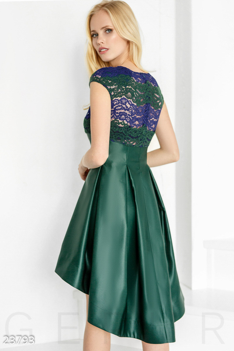 Cocktail dress by Gepur designers, with a colorful guipure yoke, neat short sleeves and an asymmetrical royal satin skirt that forms a soft cascade.