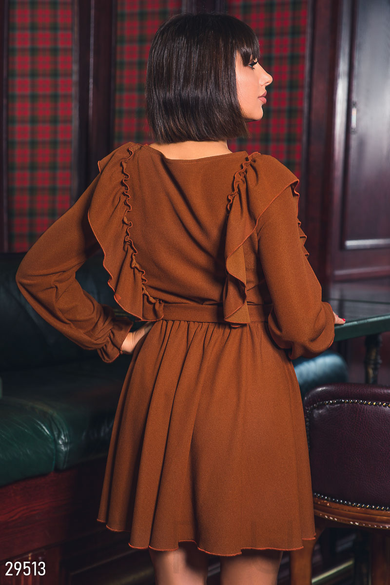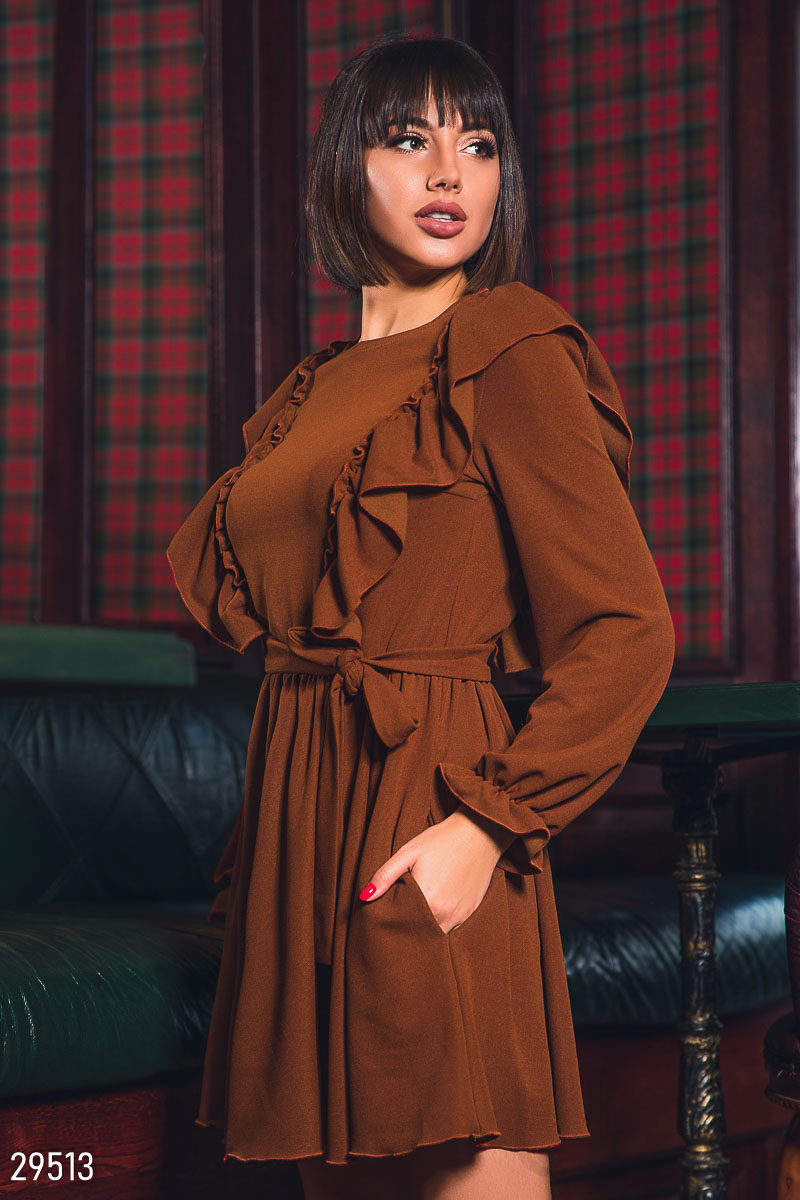 Изящное платье-мини с оборками спереди, круглым вырезом, съемным поясом в тон, рукавом-епископ на эластичной манжете и юбкой в складку.