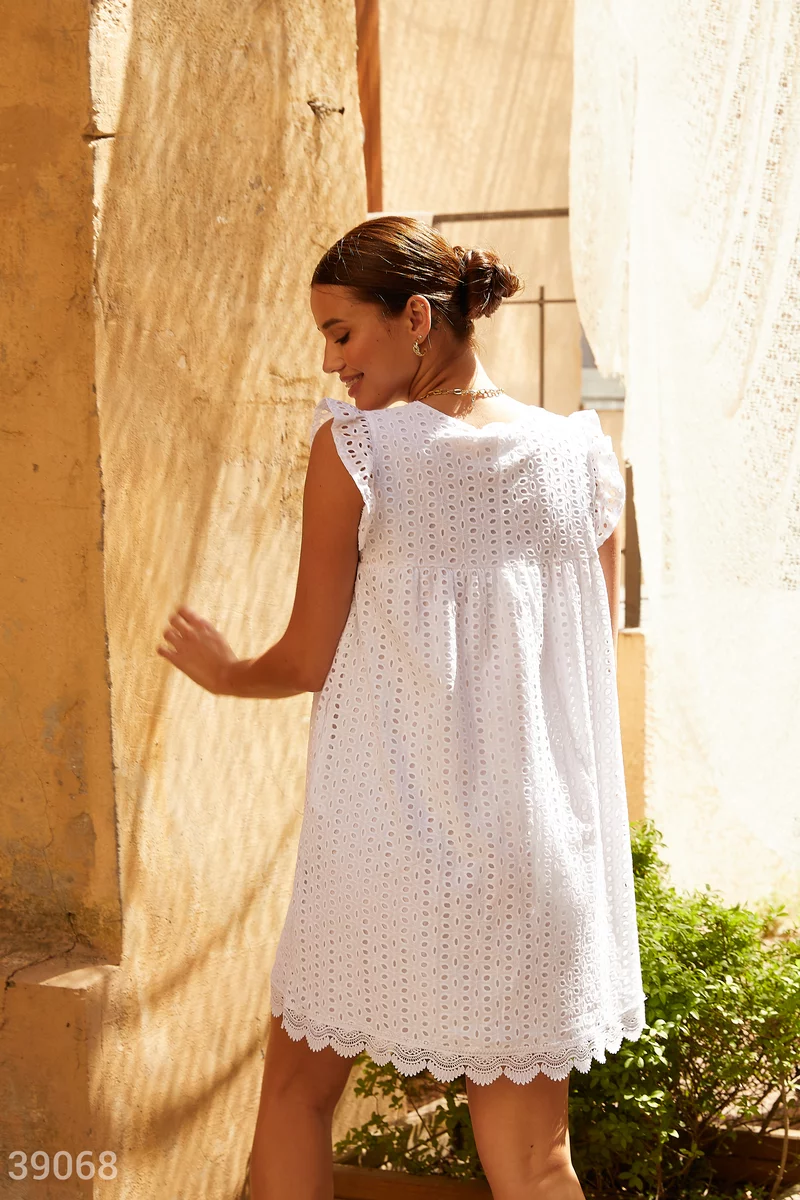 Lightweight, loose-fitting dress in cotton fabric with floral embroidery. The neat yoke of the dress is embellished with a v-neckline and cap sleeves. The dress is complemented by two small pockets in the seams and a lace trim at the hem.