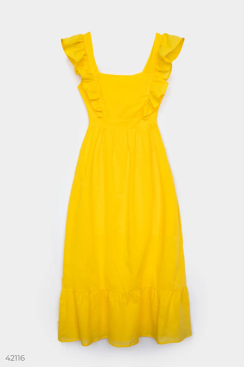 Lightweight cotton fabric makes any thing more feminine, especially when it comes to a fitted dress with a wide frill on a flared hem. For sewing this model, they chose a yellow lightweight cotton-based material, which is ideal for the summer period. The product was supplemented with winged sleeves.
