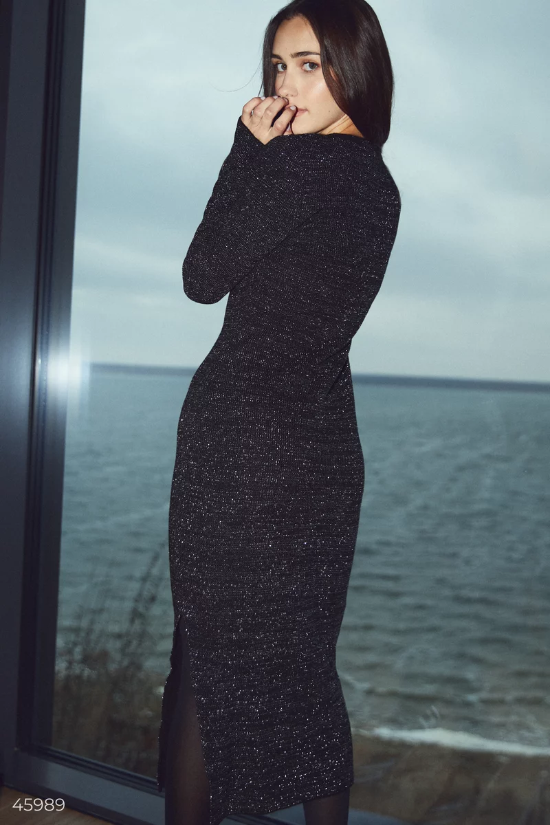 Black midi dress with shiny lurex thread that shimmers seductively. Perfectly emphasizes the silhouette. Model with a round neck, has a cut on the side. Collar and sleeves with elastic cuff. The dress is coolly styled with everyday looks and for any event. Can be combined with a jacket, an aviator coat, as well as with boots, classic or more massive boots, or pumps.