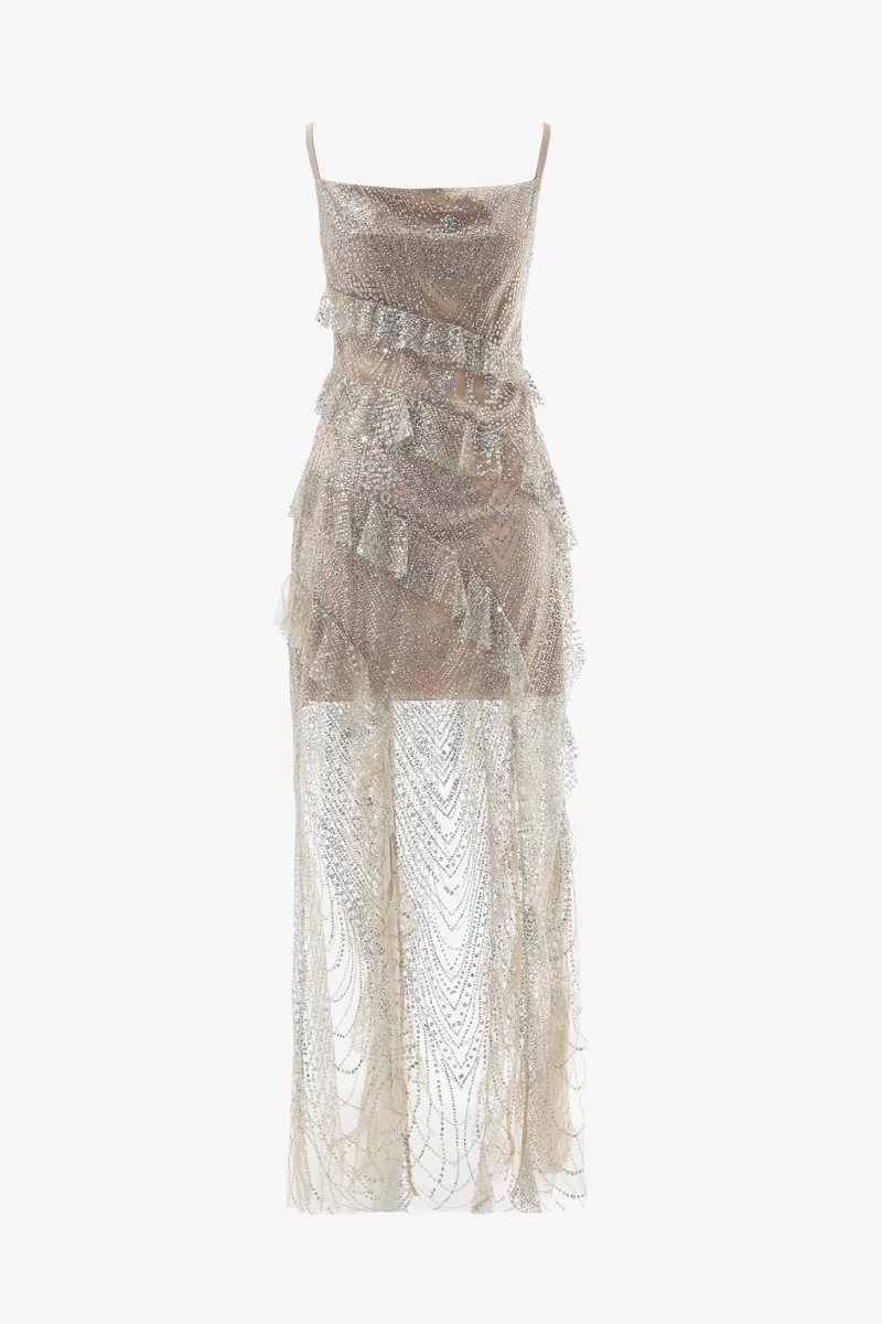 Asymmetrical maxi dress with sequins. Model with thin straps, the length of which can be adjusted. Fastens with a hidden zipper on the side. Not see-through, lined