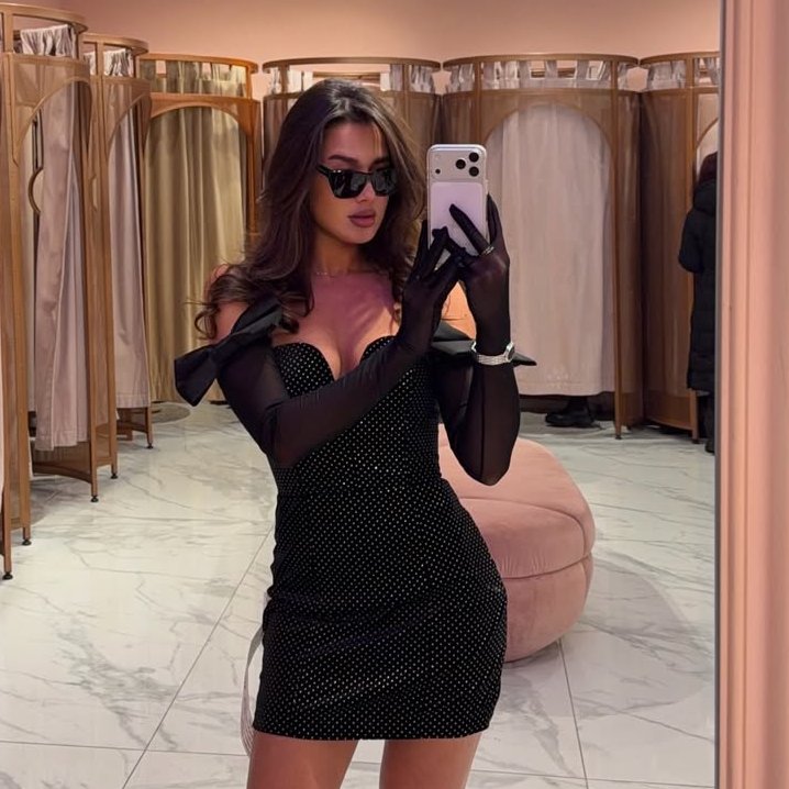 One dress – a thousand emotions. Set of a spectacular velour mini dress with sequins and gloves with decorative bows. Model with an accent neckline and an emphasized waist. Fastens with a hidden zipper at the back. Lined