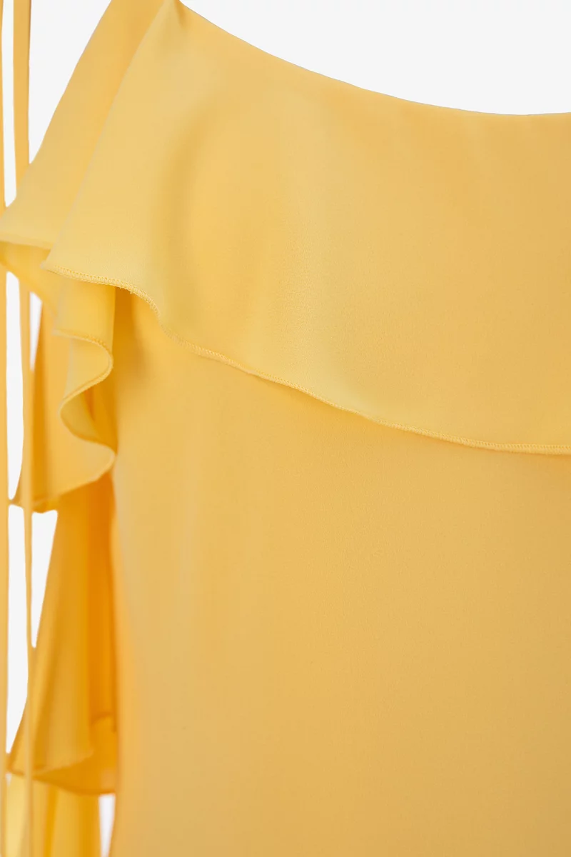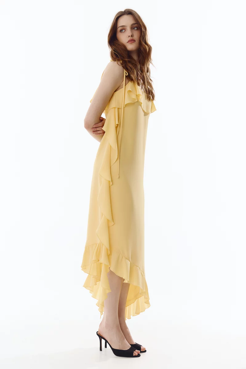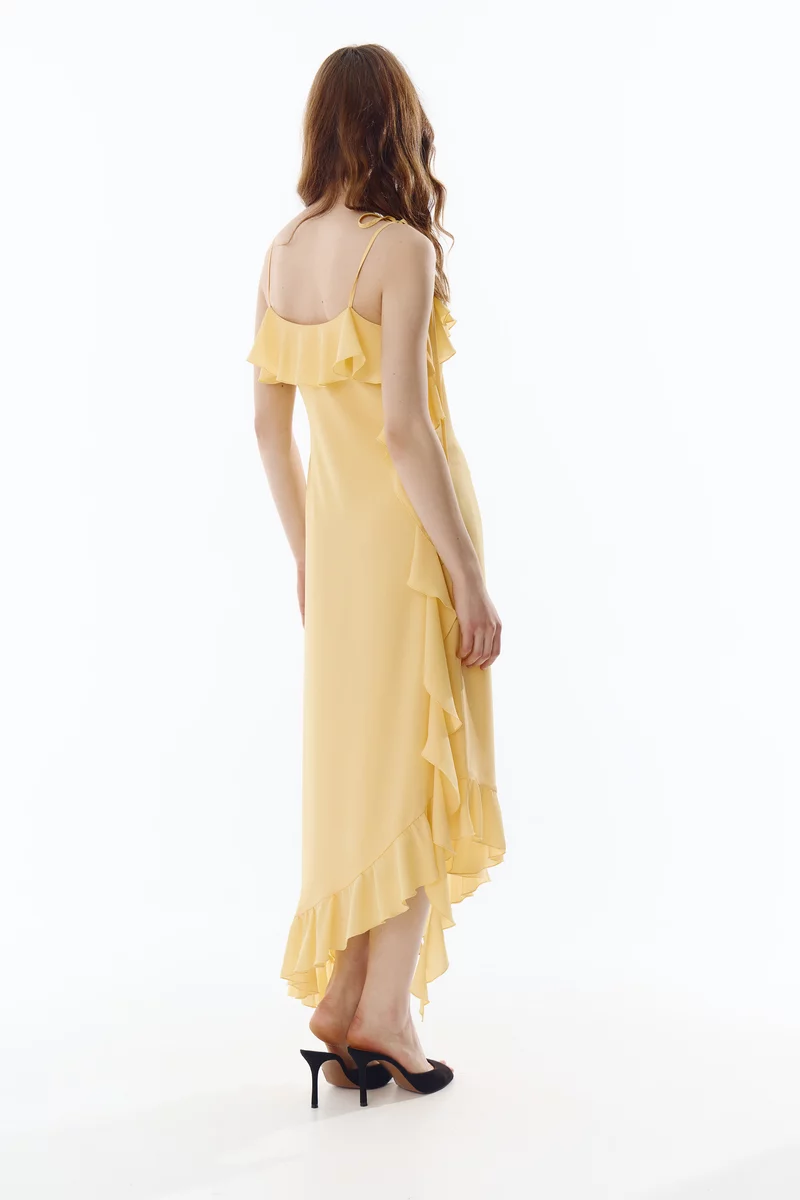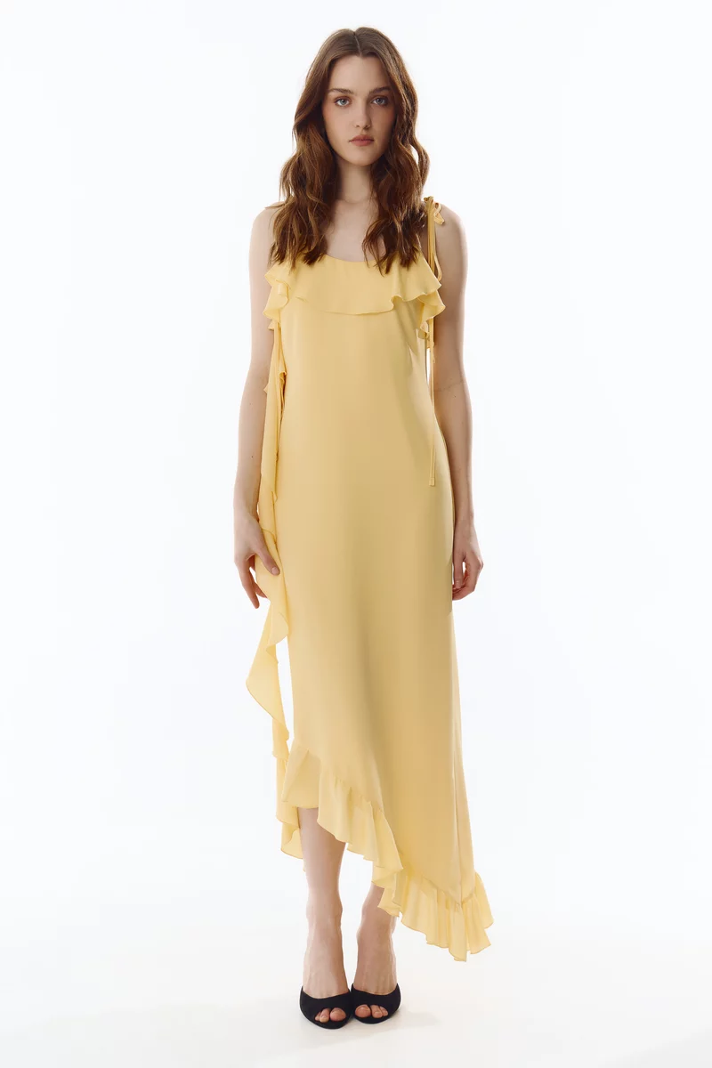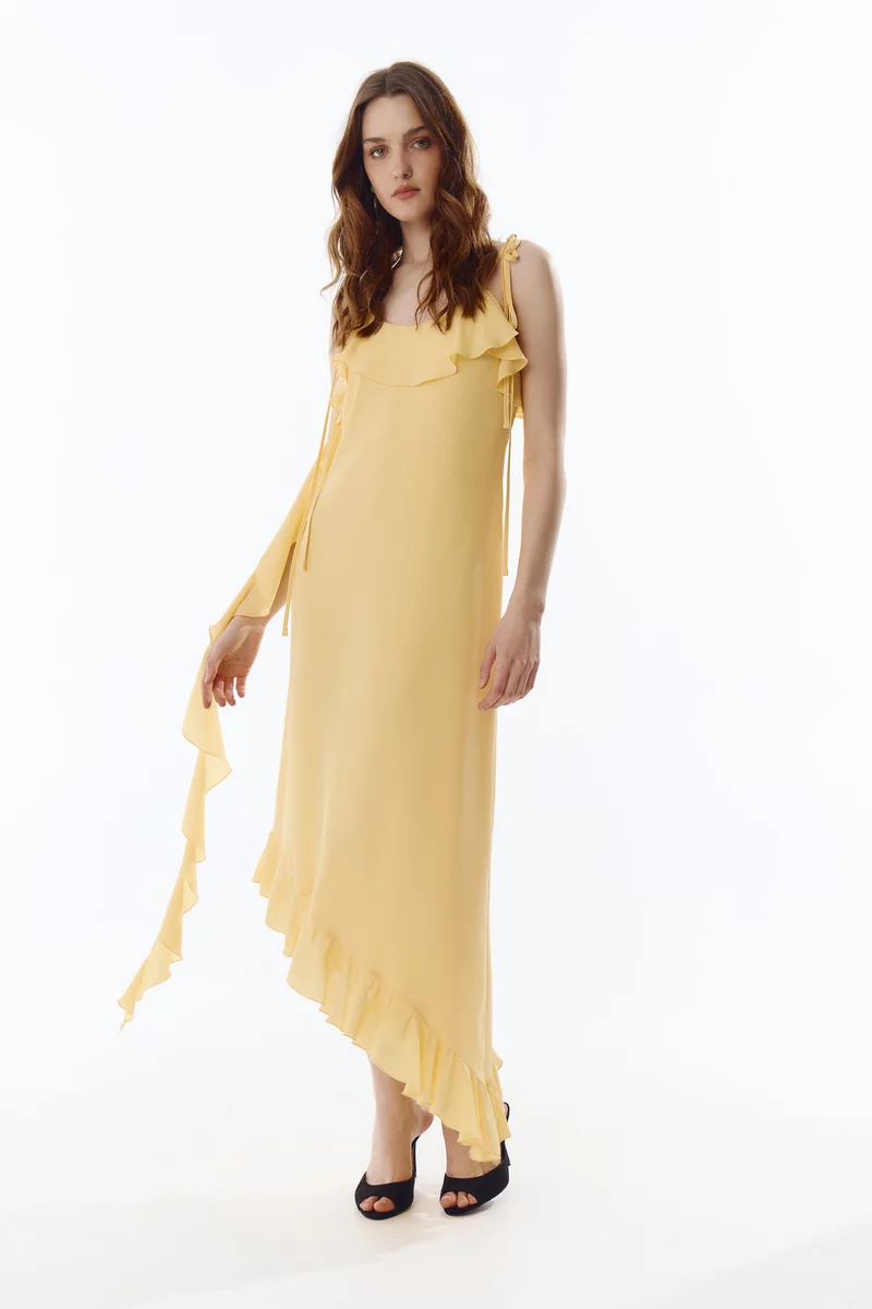 Chiffon maxi dress with a flared skirt in an asymmetrical cut. Dress with thin straps with ties. Model with accent ruffles. On a chiffon lining
