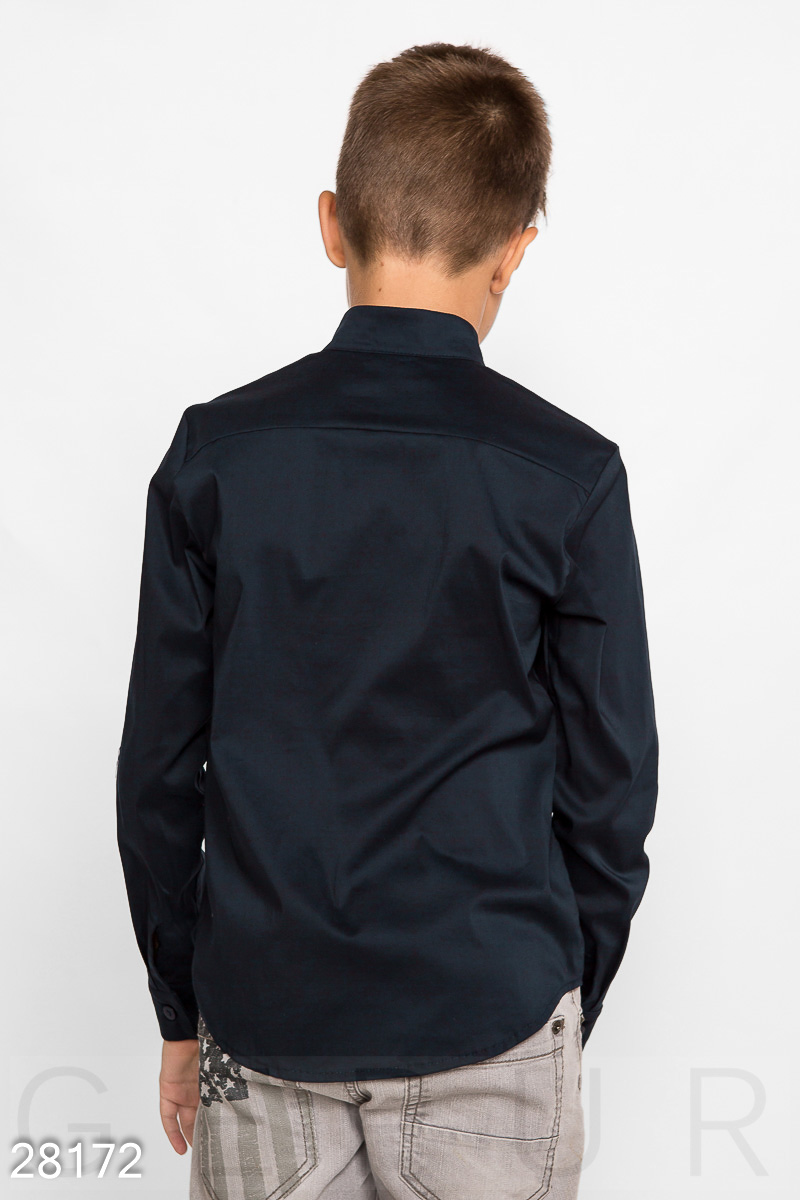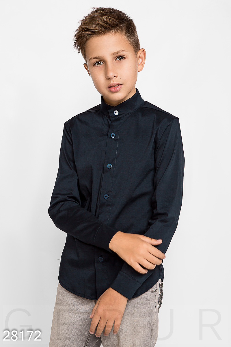 Школьная рубашка для мальчика лаконичного кроя с закругленным подолом и коротким воротником-стойка.