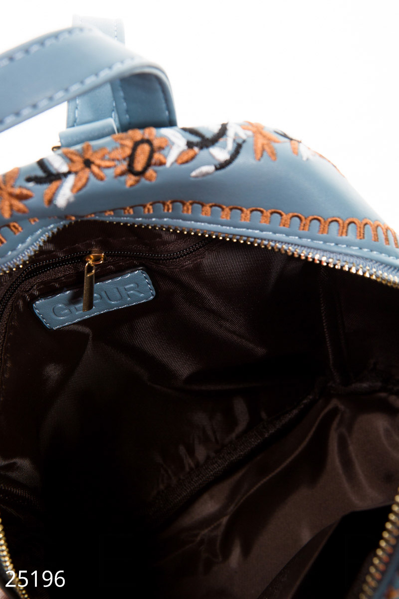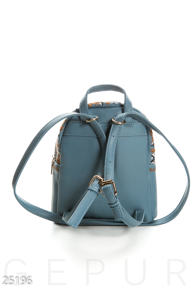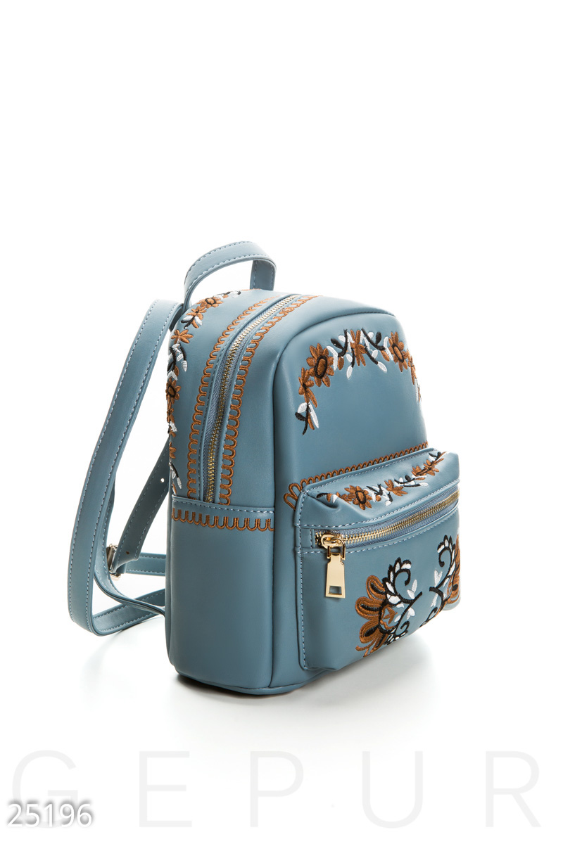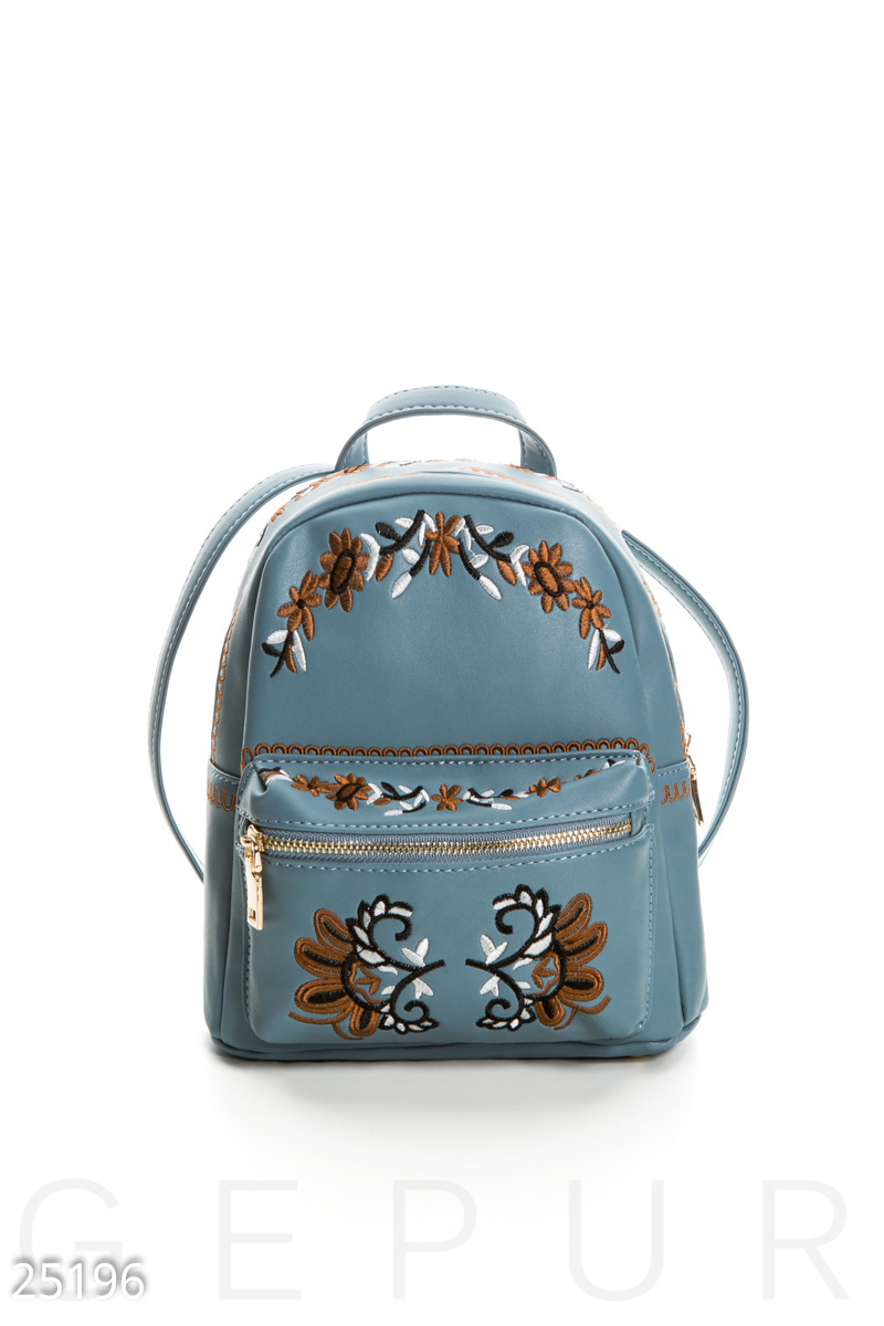 Небольшой рюкзак из мягкой эко-кожи, украшенный цветной вышивкой: накладной карман на молнии, узкие регулируемые лямки и металлические заклепки.