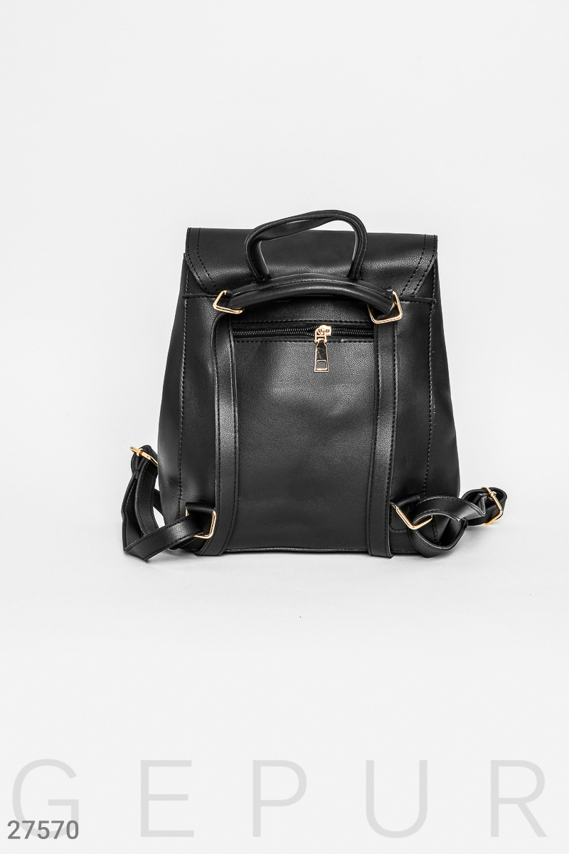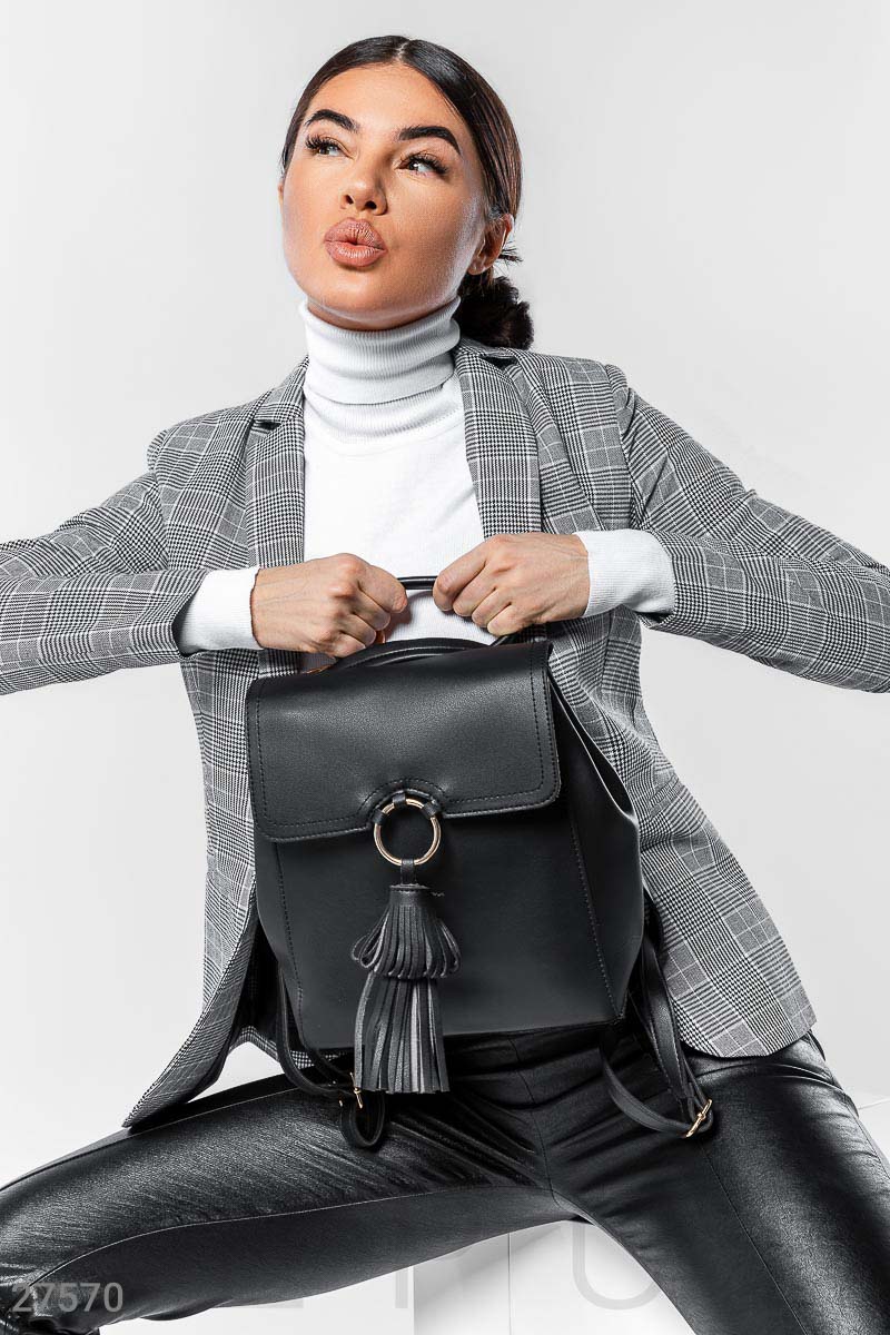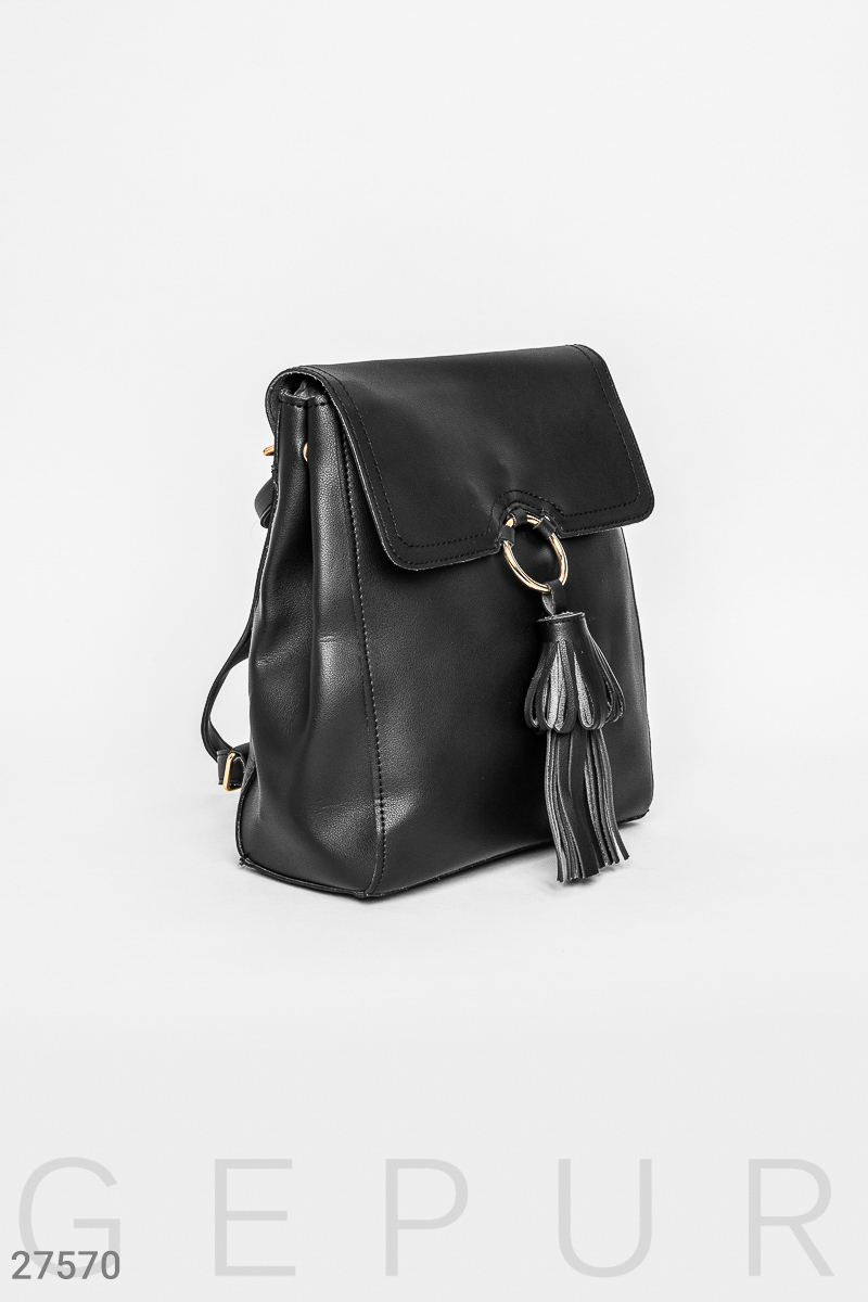 Повседневная сумка-рюкзак из эко-кожи: застежка-клапан на магнитной кнопке с молнией и декоративным кольцом с массивной кисточкой, небольшой прорезной карман на молнии, регулируемые лямки.