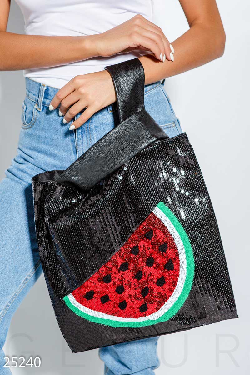Сумка яркая , пайетки пришиты качественно , эко кожа очень мягкая . Смотрится очень красиво . Достаточно большая сумка , удобная , без застежки .