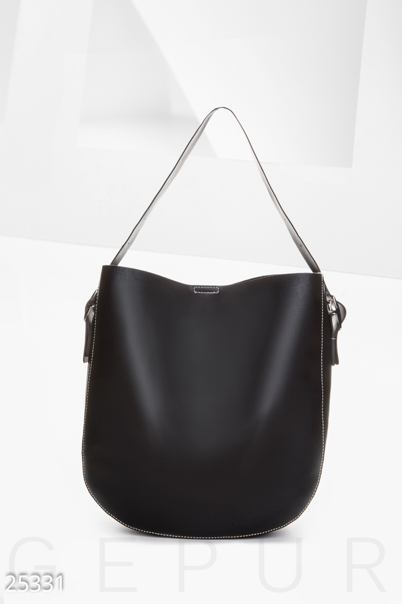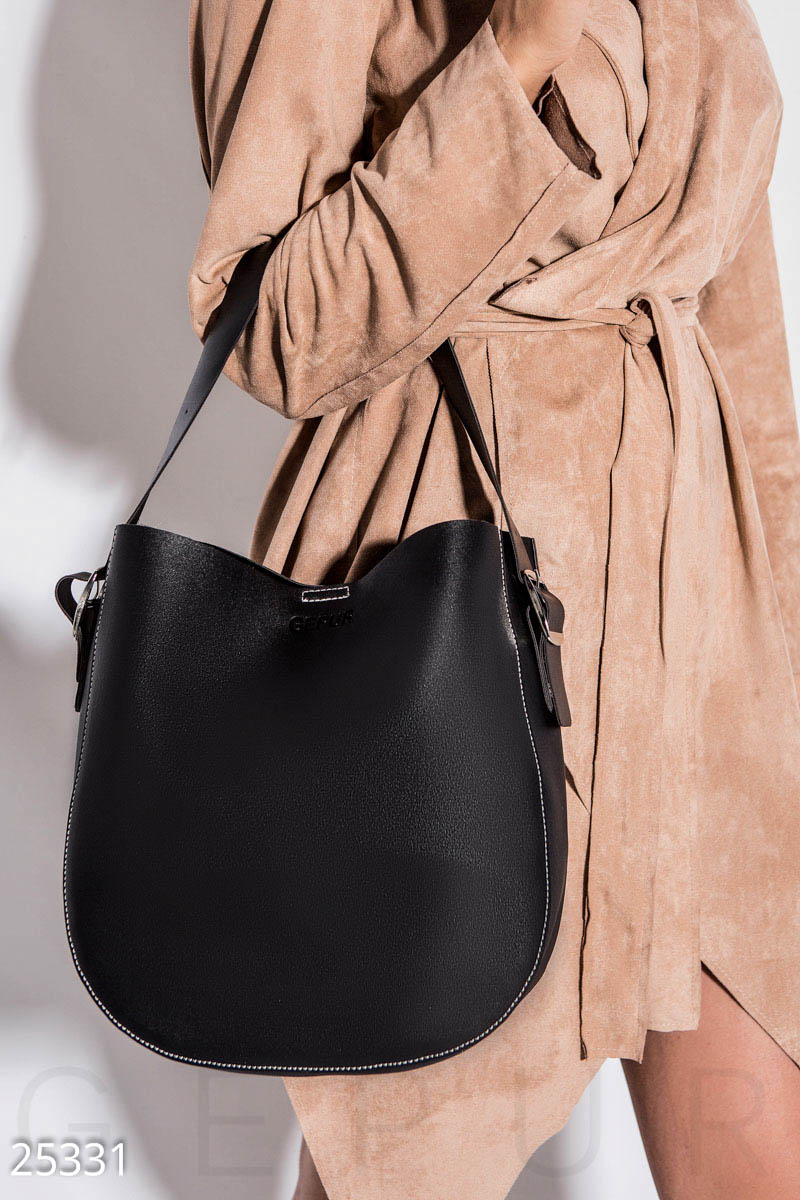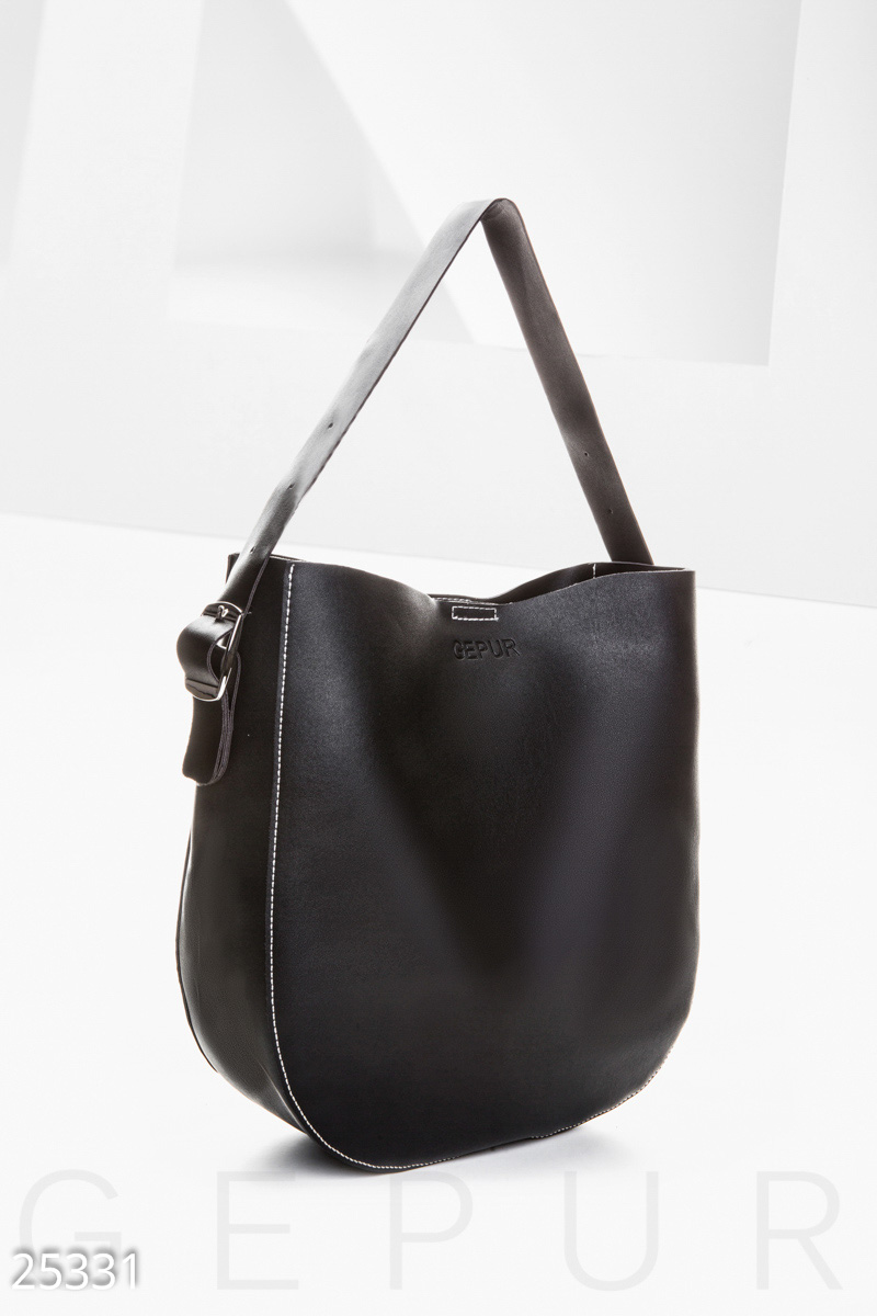 Лаконичная сумка-полумесяц из эко-кожи с коротким ремешком на пряжке и контрастной строчкой.