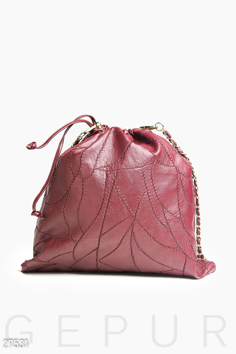 Трендовая женская сумка-мешок, выполненная из мягкой эко-кожи с фигурной строчкой. Сумка дополнена репсовой лентой на лицевой стороне и съемным плечевым ремешком-цепочкой.