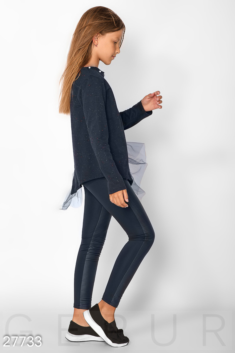 Детская трикотажная туника, расшитая бусинами: оригинальный асимметричный крой и фатиновая вставка сбоку.