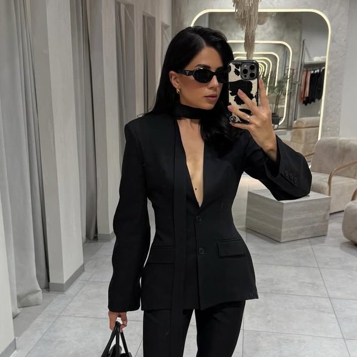 Single-breasted, elongated jacket with an emphasized waist. Side pockets with flaps. The model comes with a matching belt that can be used to style the jacket. Additional inserts are provided in the shoulders to maintain strict lines. Lined