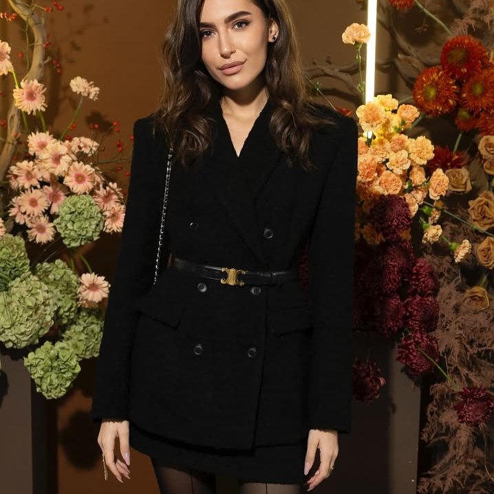 Basic double-breasted coat-jacket with boucle with the addition of wool. Dense and very comfortable fabric that forms a perfect silhouette, keeps its shape, adds structure to the image and gives warmth on cool days