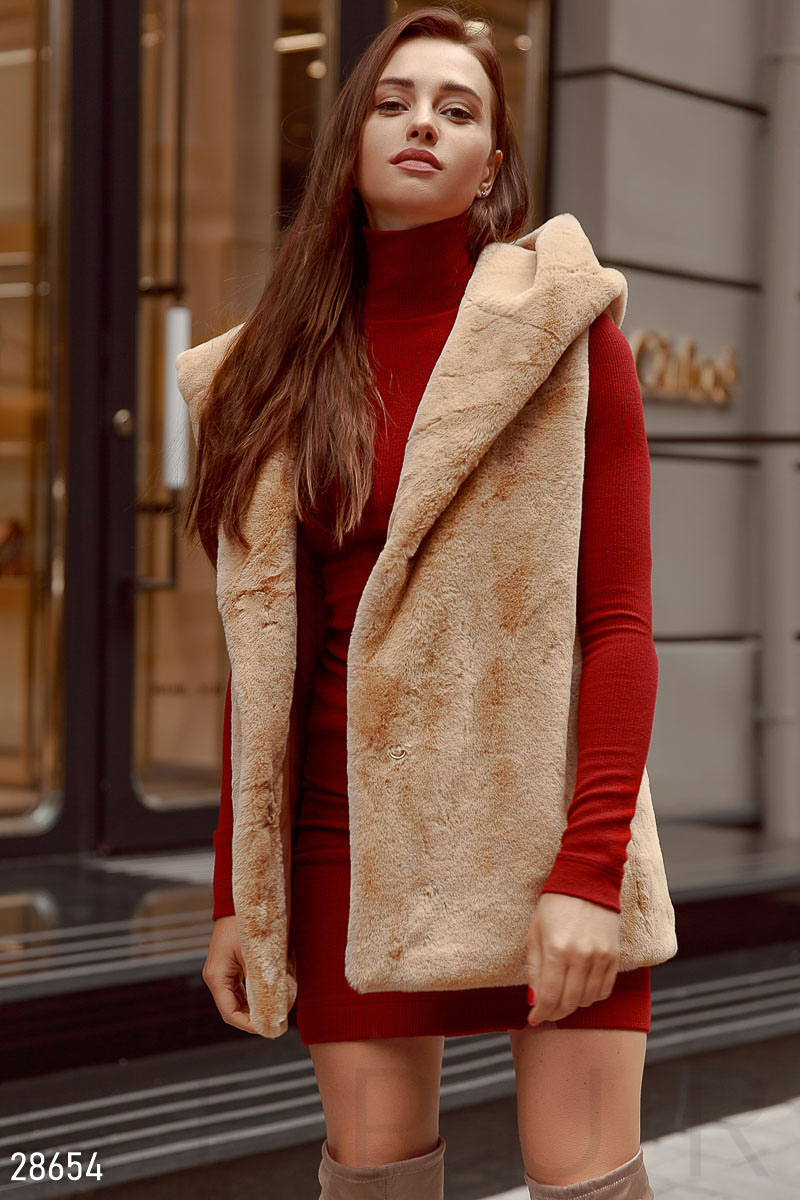 Теплый женский жилет прямого кроя, выполненный из мягкого эко-меха premium класса: удобный капюшон, два небольших кармана в швах и съемный пояс в тон.