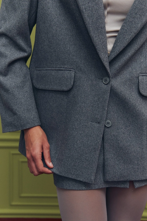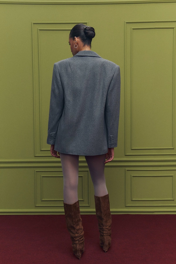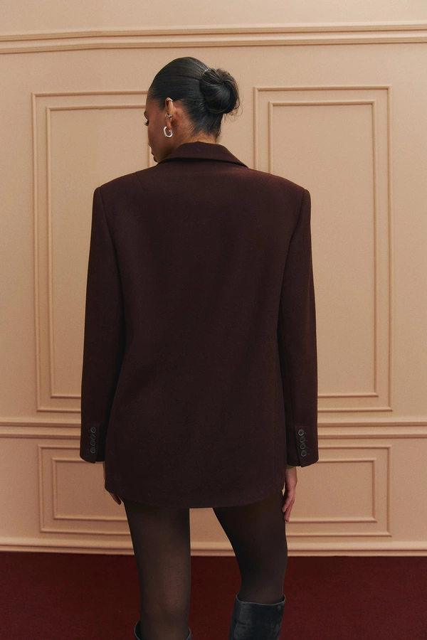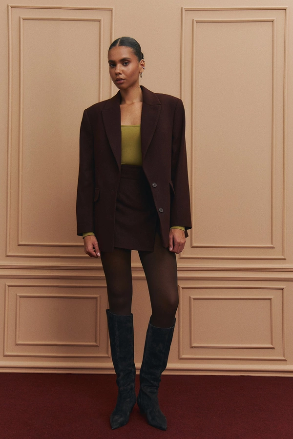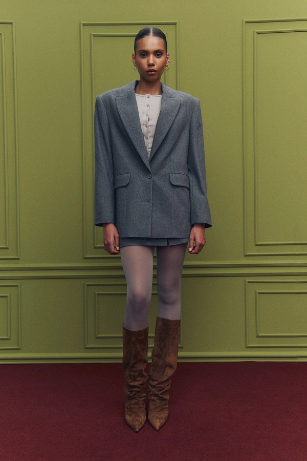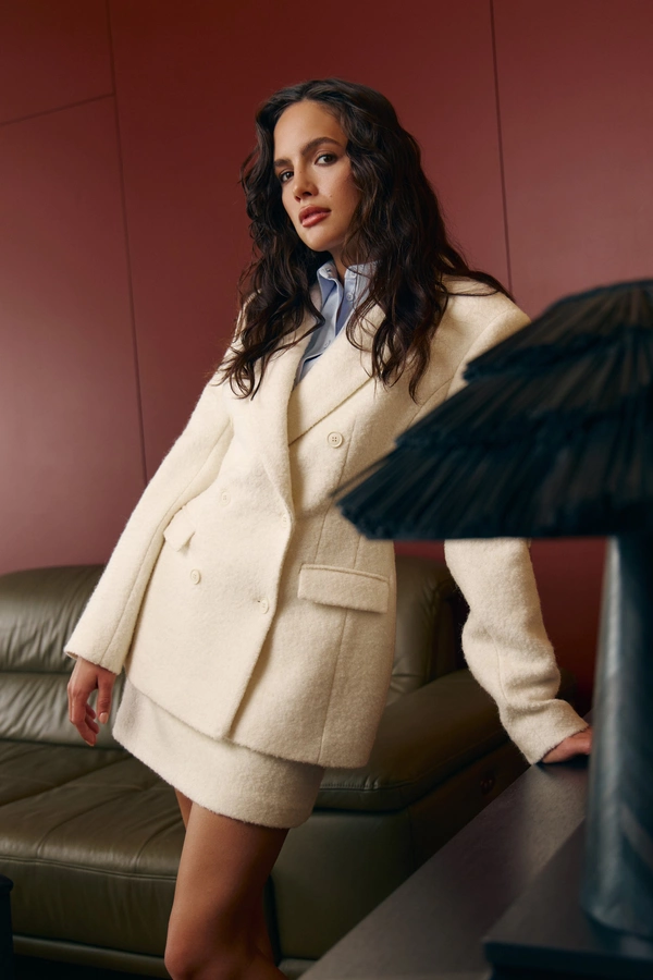 Пальто oversize или с четкими плечами.